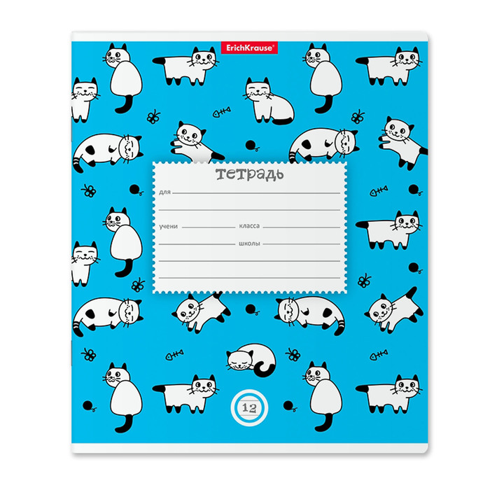 Тетрадь 12 листов, линейка, Erich Krause Cats, голубой, картонная обложка 170 г/м2