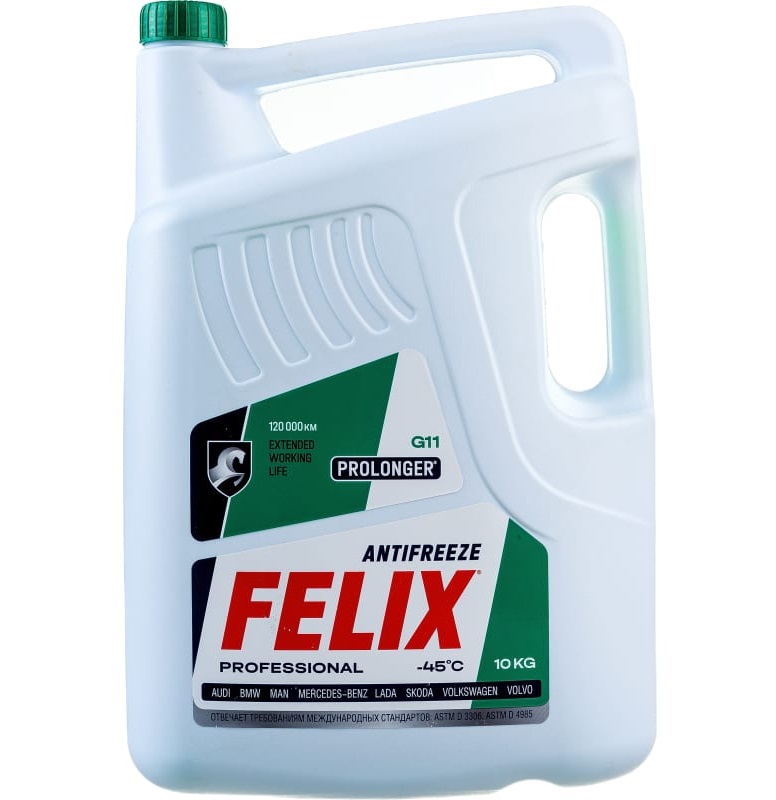 Антифриз Felix Prolonger G11 представляет собой жидкость охлаждающую низкозамерзающую на основе этиленгликоля и специально очищенной воды, не содержащую аминов, фосфатов и боратов. Разработан по гибридной технологии, содержит в себе набор силикатных присадок. Обеспечивает быстрый прогрев двигателя при отрицательных температурах окружающего воздуха до -40 °С. Обладает повышенной термостабильностью и теплопроводностью. Исключает возможность образования накипи и отложений. Имеет оптимальные смазывающие свойства. Готов к применению. Срок службы антифриза — 120 000 км или 3 года.