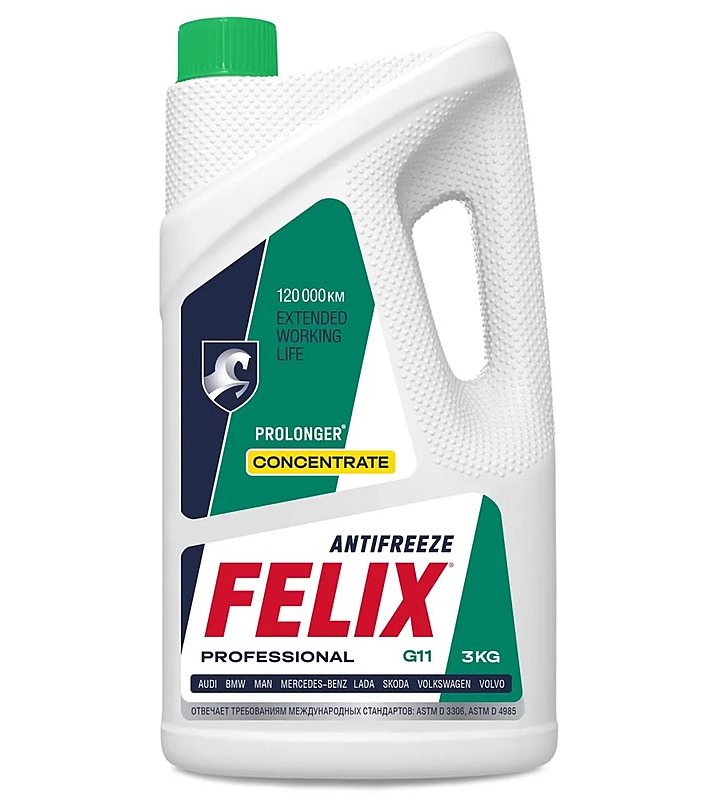 Антифриз Felix Prolonger G11 представляет собой жидкость охлаждающую низкозамерзающую на основе этиленгликоля и специально очищенной воды, не содержащую аминов, фосфатов и боратов. Разработан по гибридной технологии, содержит в себе набор силикатных присадок. Обеспечивает быстрый прогрев двигателя при отрицательных температурах окружающего воздуха до -40 °С. Обладает повышенной термостабильностью и теплопроводностью. Исключает возможность образования накипи и отложений. Имеет оптимальные смазывающие свойства. Срок службы антифриза — 120 000 км или 3 года.