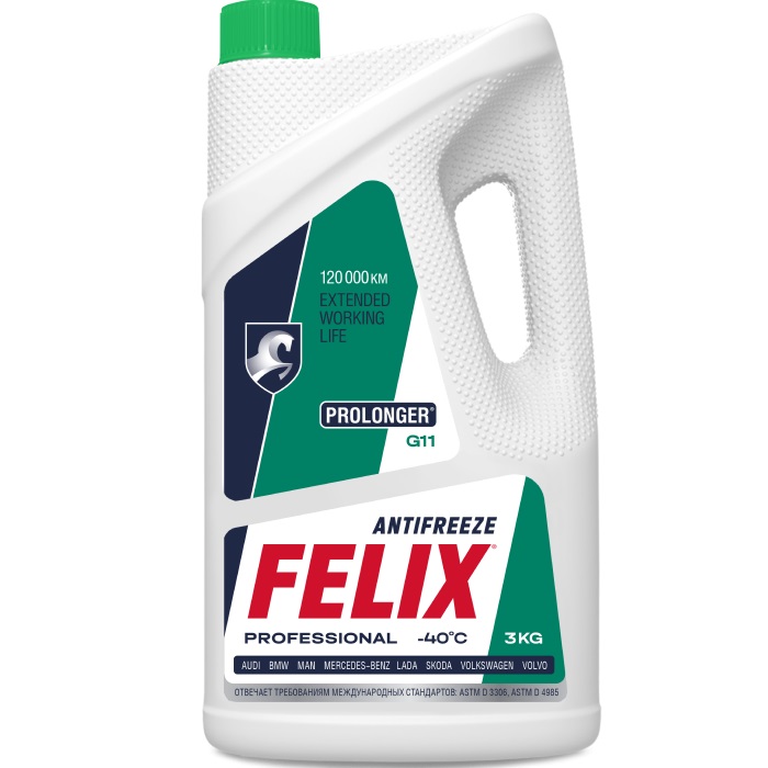 Антифриз Felix Prolonger G11 представляет собой жидкость охлаждающую низкозамерзающую на основе этиленгликоля и специально очищенной воды, не содержащую аминов, фосфатов и боратов. Разработан по гибридной технологии, содержит в себе набор силикатных присадок. Обеспечивает быстрый прогрев двигателя при отрицательных температурах окружающего воздуха до -40 °С. Обладает повышенной термостабильностью и теплопроводностью. Исключает возможность образования накипи и отложений. Имеет оптимальные смазывающие свойства. Готов к применению. Срок службы антифриза — 120 000 км или 3 года.