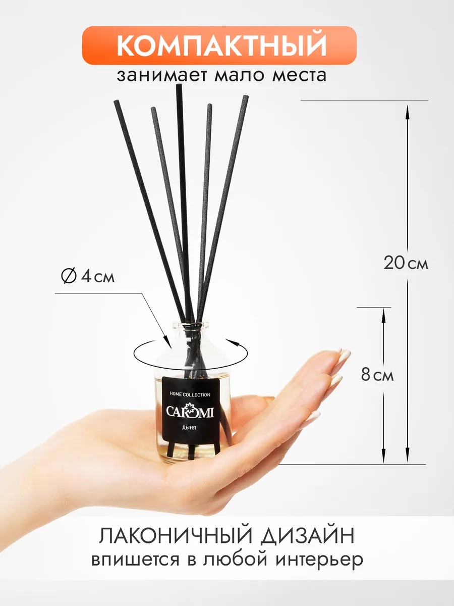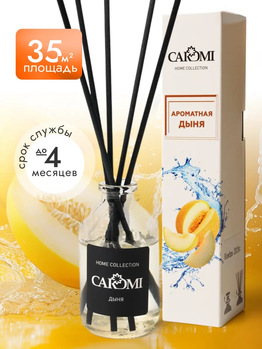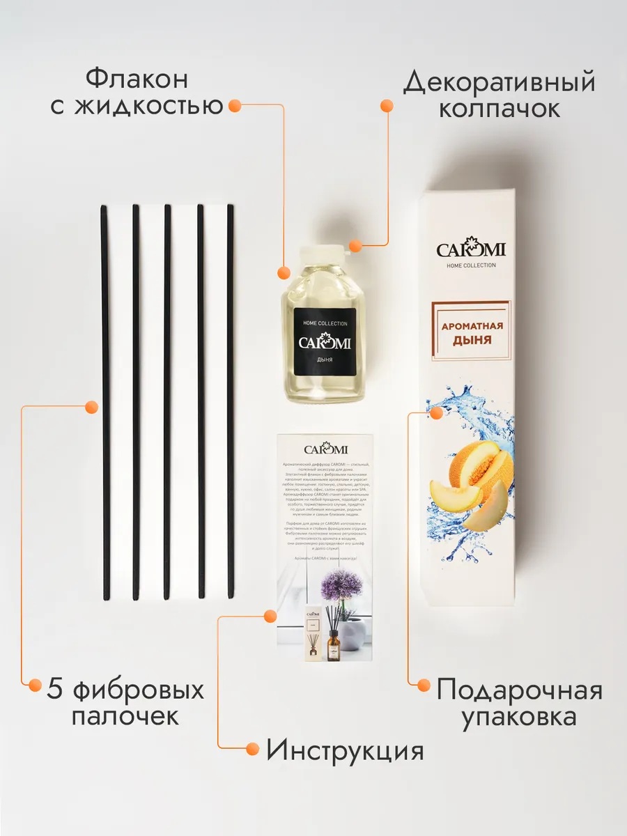 Аромадиффузор с палочками Caromi Ароматная дыня создан на основе французских парфюмированных отдушек премиум-качества. Ароматизатор для дома сочетает в себе стильный дизайн и стойкий аромат. Изящный стеклянный флакон удачно впишется в любой интерьер и станет изысканным элементом декора. А красивая подарочная упаковка позволит сделать презент любимому человеку.