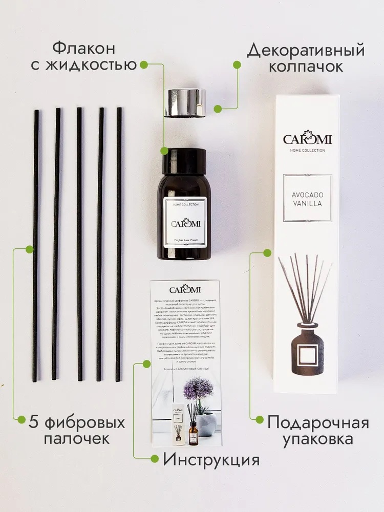 Аромадиффузор с палочками Caromi Avocado Vanilla создан на основе французских парфюмированных отдушек премиум-качества. Ароматизатор для дома сочетает в себе стильный дизайн и стойкий аромат. Изящный стеклянный флакон удачно впишется в любой интерьер и станет изысканным элементом декора. А красивая подарочная упаковка позволит сделать презент любимому человеку.