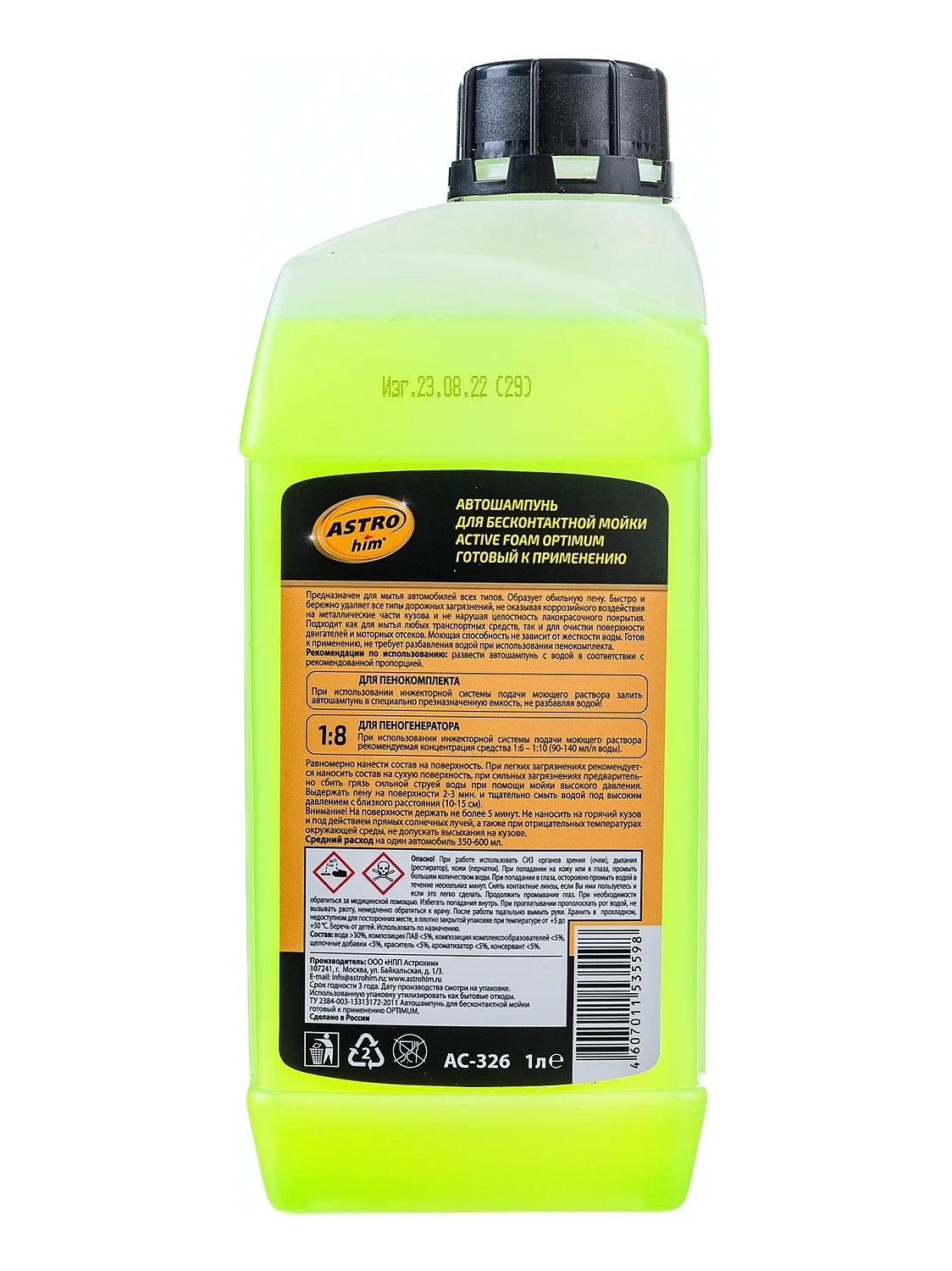Active Foam OPTIMUM AC326 создан по технологии и на основе ультрасовременных компонентов нидерландской компании AkzoNobel. Благодаря этому автошампунь обеспечивает бережный уход за кузовом автомобиля, эффективно отмывая дорожные загрязнения как в мягкой, так и в жесткой воде, и не оставляя белесого налета. А специальные добавки, содержащиеся в составе, поднимают и обволакивают частички грязи, защищая лакокрасочное покрытие от царапин.