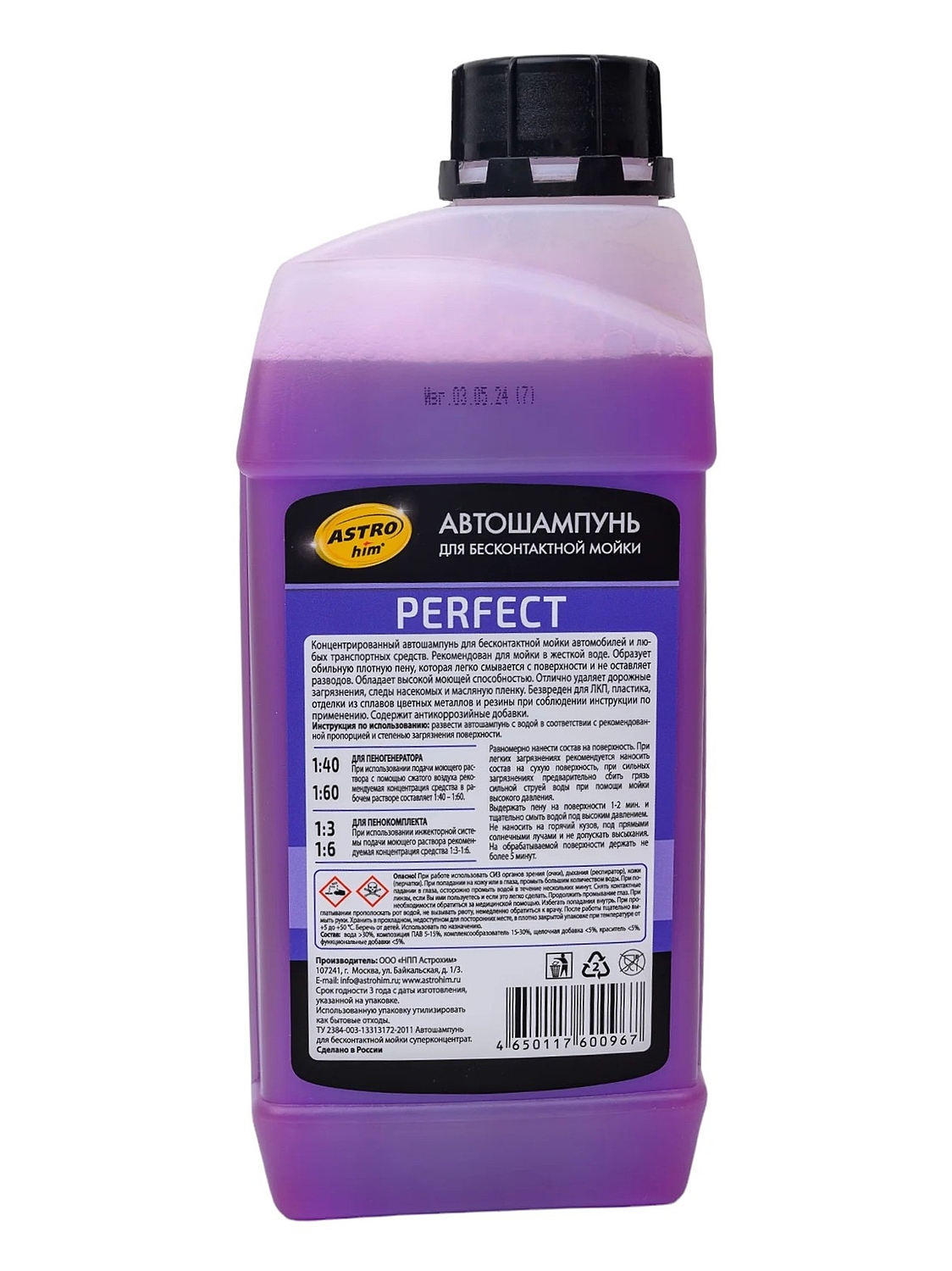 Концентрированный автошампунь ASTROhim PERFECT AC3031 для бесконтактной мойки автомобилей и любых транспортных средств рекомендован для мойки в жесткой воде. Образует обильную плотную пену, которая легко смывается с поверхности и не оставляет разводов. Обладает высокой моющей способностью. Отлично удаляет дорожные загрязнения, следы насекомых и масляную пленку. Безвреден для ЛКП, пластика, отделки из сплавов цветных металлов и резины при соблюдении инструкции по применению. Содержит антикоррозийные добавки.