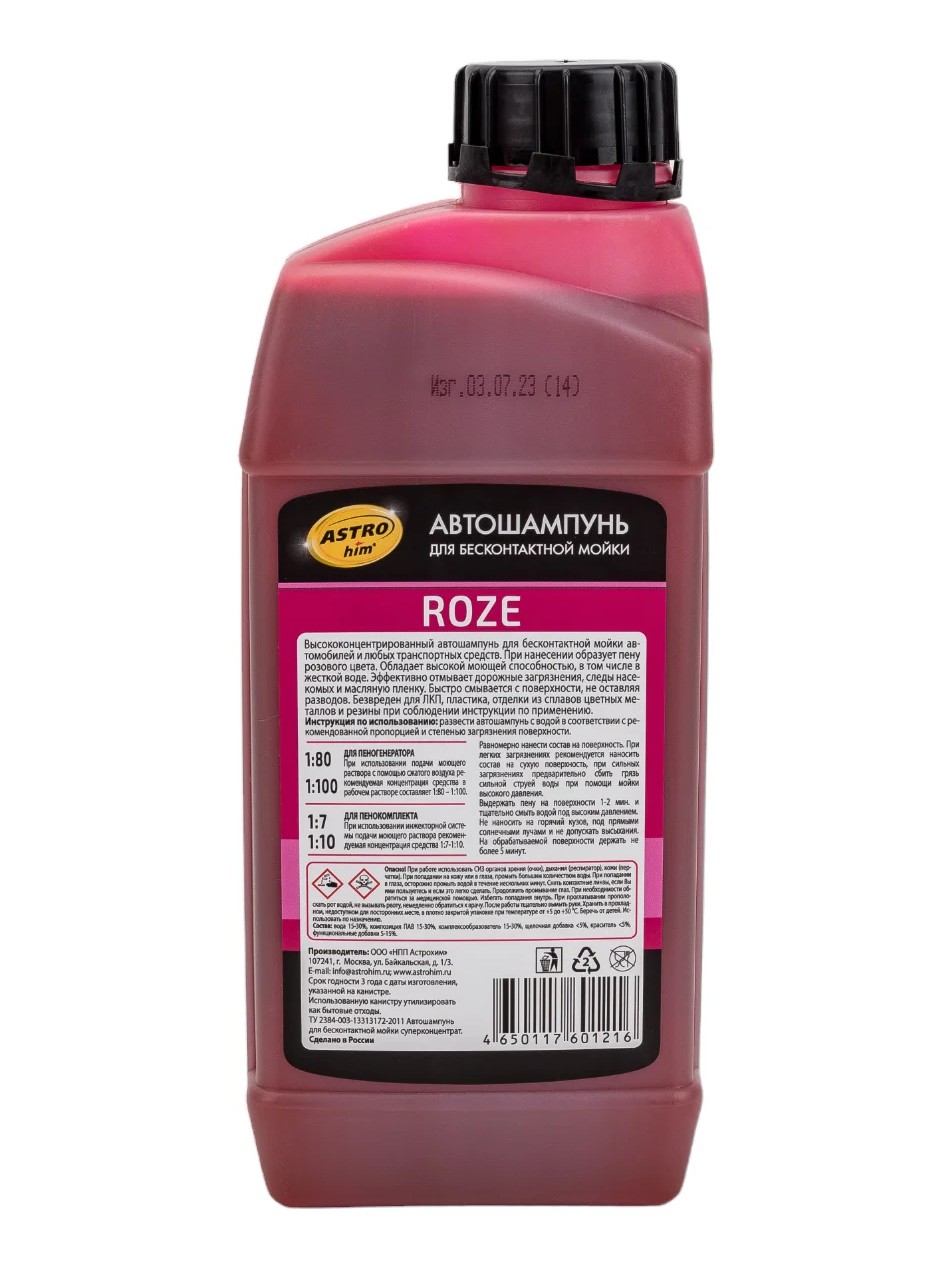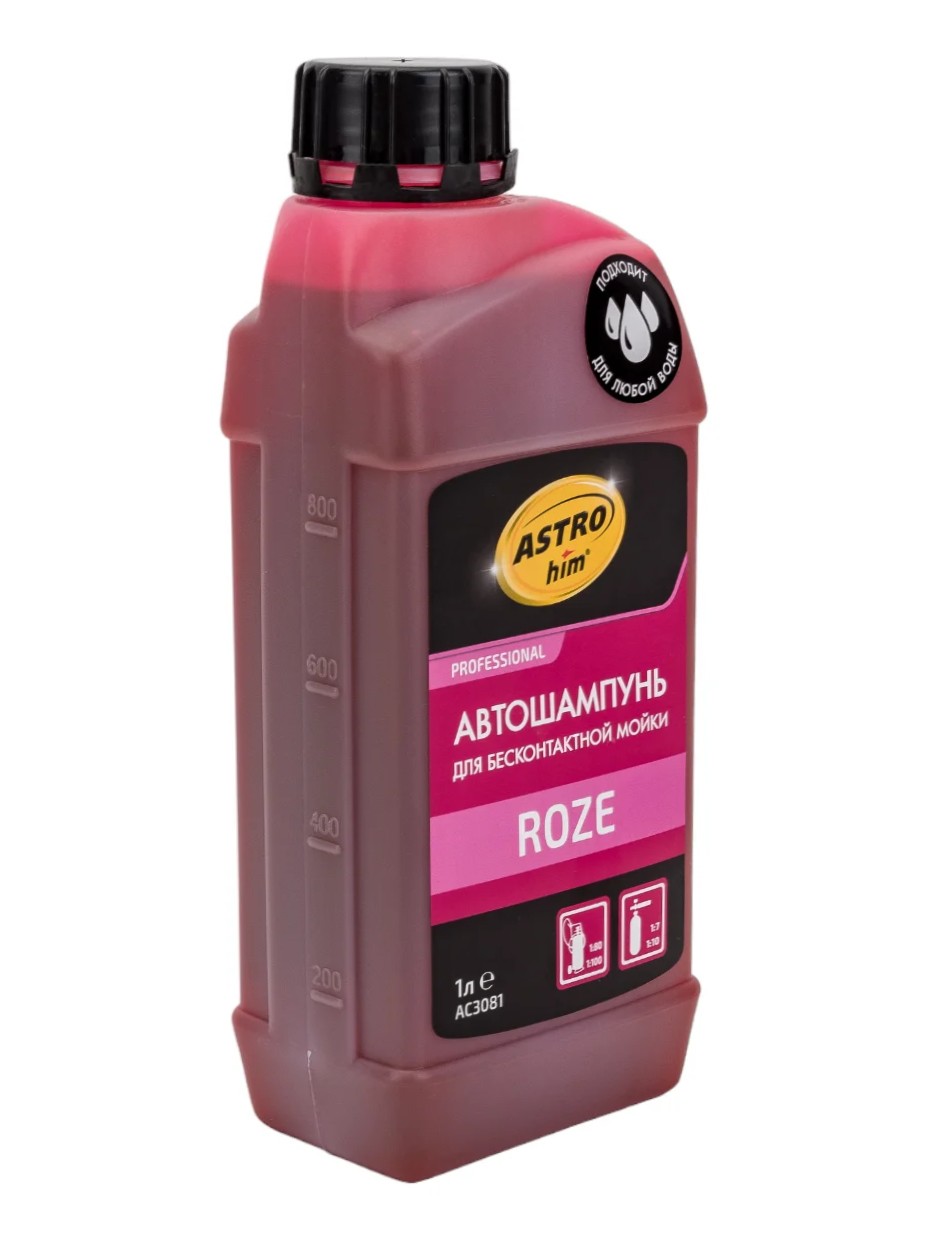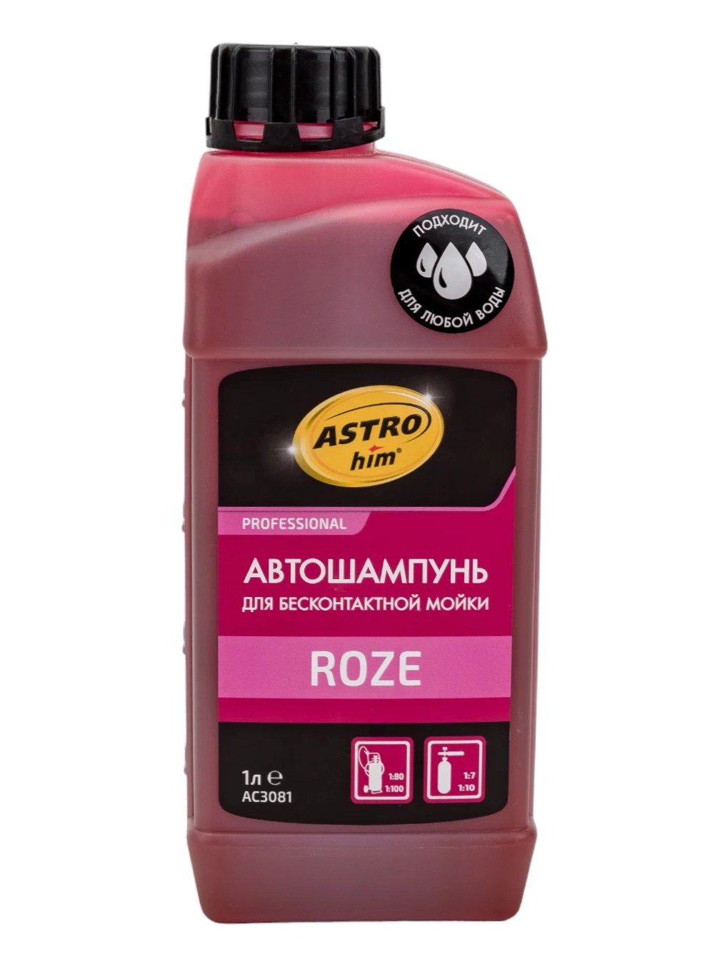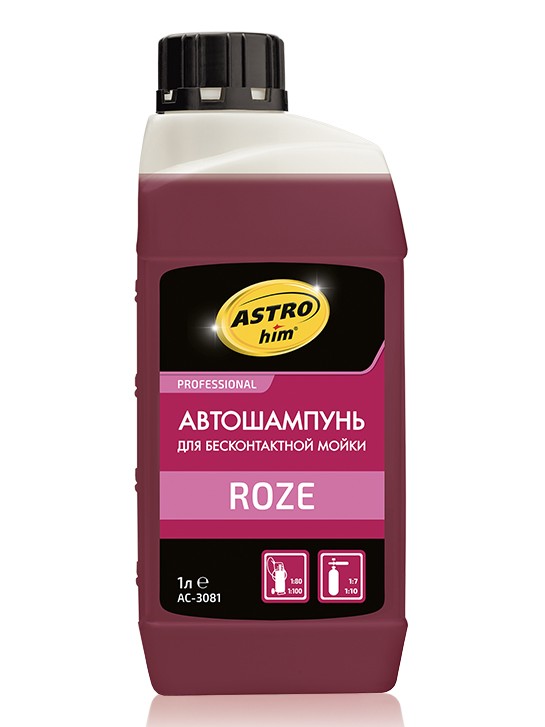 Высококонцентрированный автошампунь ASTROhim ROZE AC3081 для бесконтактной мойки автомобилей и любых транспортных средств при нанесении образует пену розового цвета. Обладает высокой моющей способностью, в том числе в жесткой воде. Эффективно отмывает дорожные загрязнения, следы насекомых и масляную пленку. Быстро смывается с поверхности, не оставляя разводов. Безвреден для ЛКП, пластика, отделки из сплавов цветных металлов и резины при соблюдении инструкции по применению.