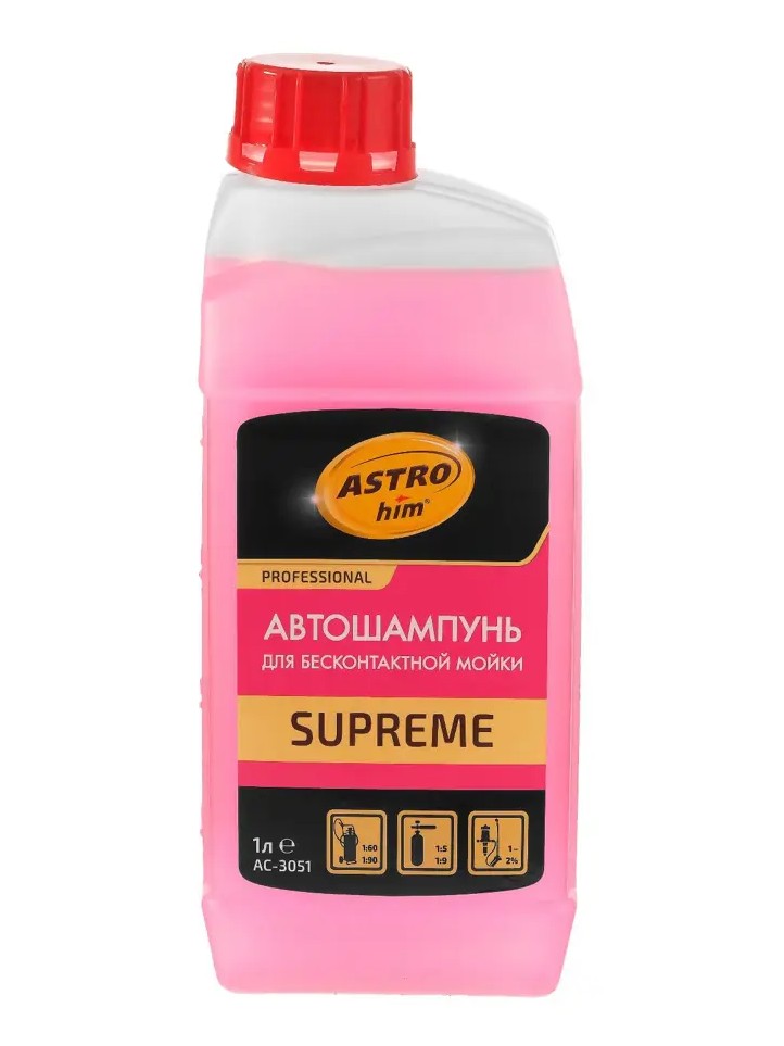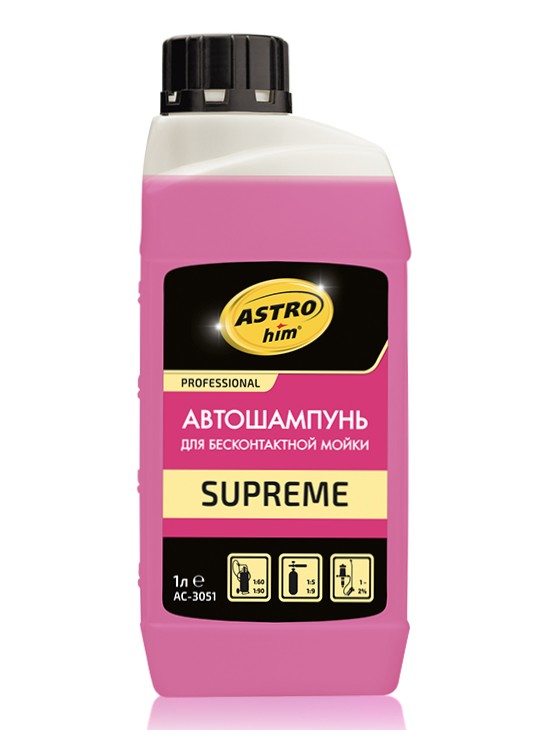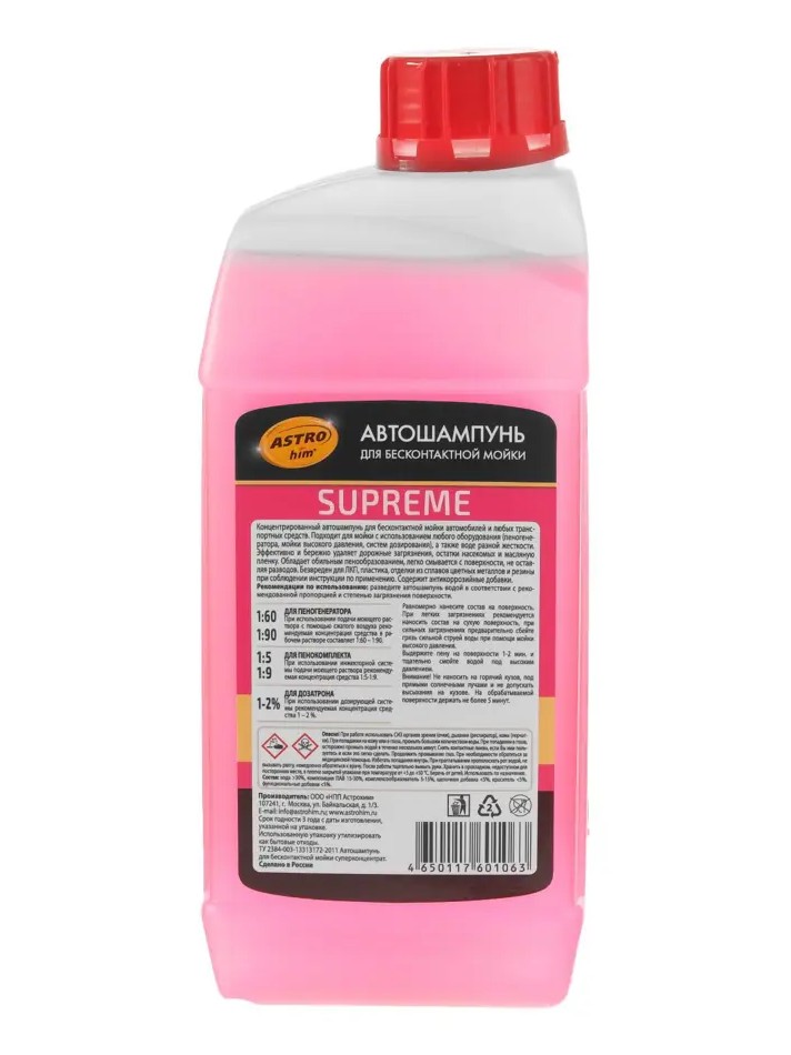 Концентрированный автошампунь ASTROhim SUPREME AC3051 для бесконтактной мойки автомобилей и любых транспортных средств. Подходит для мойки с использованием любого оборудования (пеногенератора, мойки высокого давления, систем дозирования), а также воде разной жесткости. Эффективно и бережно удаляет дорожные загрязнения, остатки насекомых и масляную пленку. Обладает обильным пенообразованием, легко смывается с поверхности, не оставляя разводов. Безвреден для ЛКП, пластика, отделки из сплавов цветных металлов и резины при соблюдении инструкции по применению. Содержит антикоррозийные добавки.