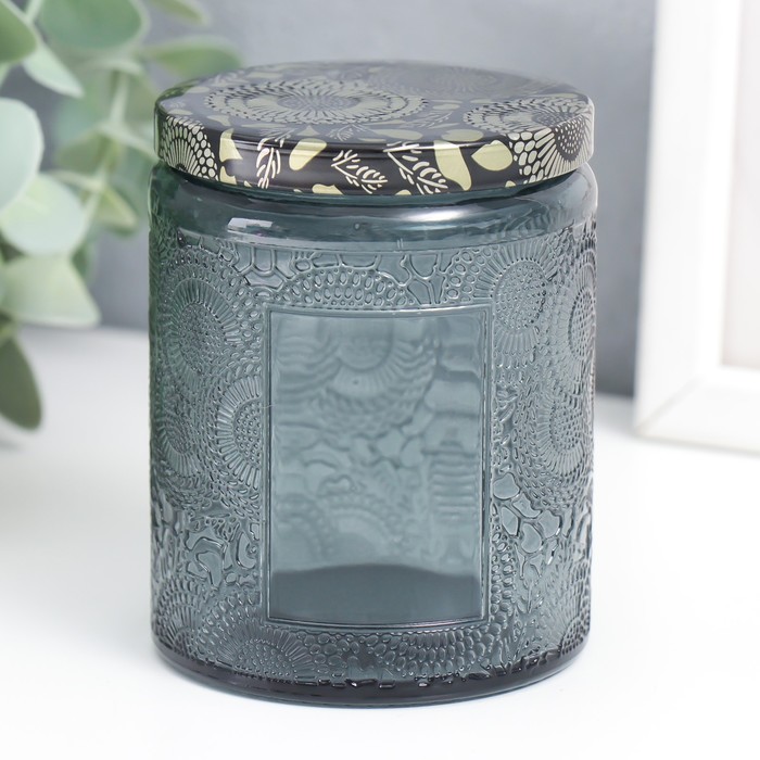 Банка для свечей стекло с крышкой "Цветочная" серая, цилиндр 9х7х7 см
