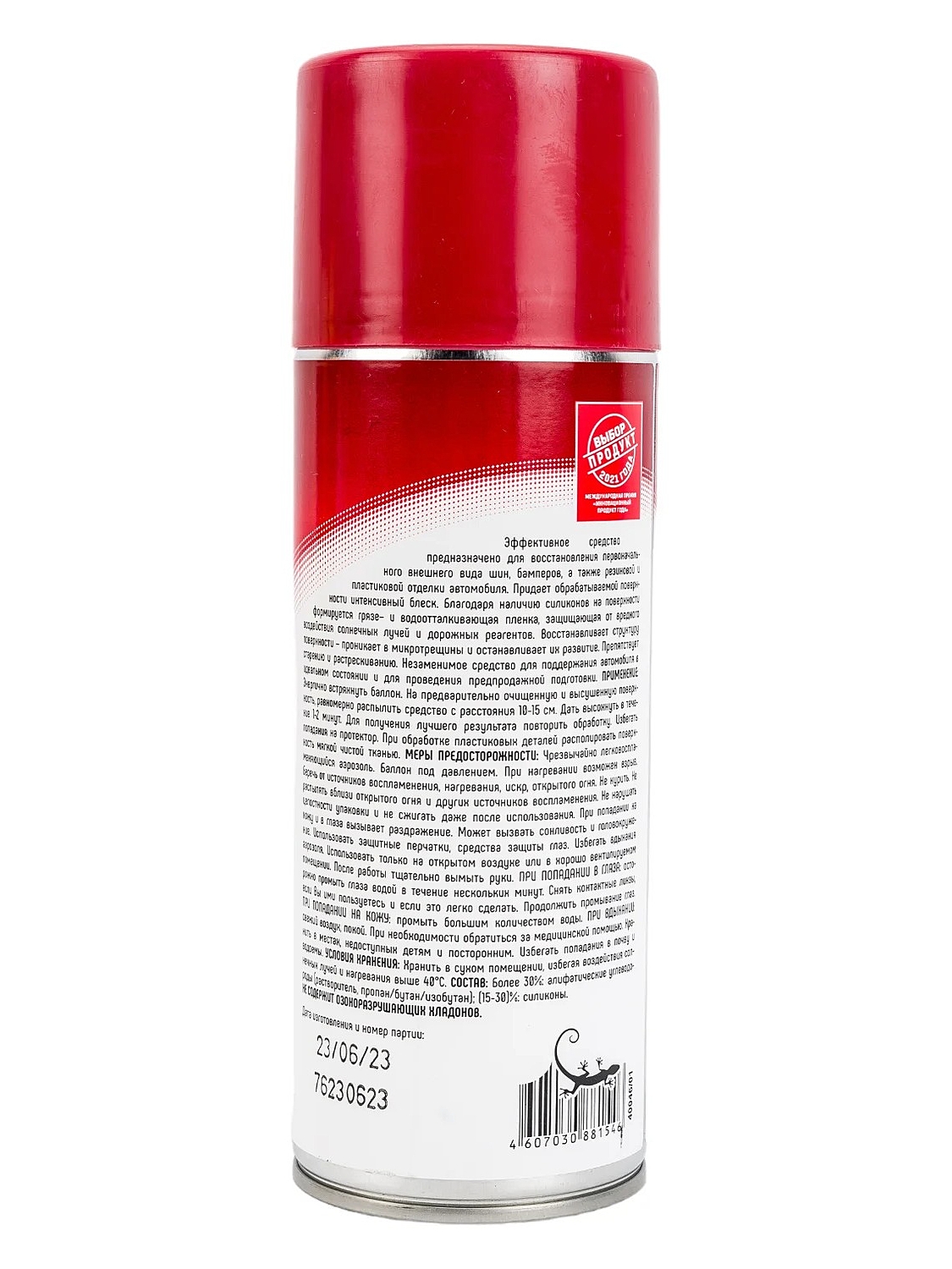 Энергично встряхнуть баллон. На предварительно очищенную и высушенную поверхность, равномерно распылить средство с расстояния 10-15 см. Дать высохнуть в течение 1-2 минут. Для получения лучшего результата повторить обработку. Избегать попадания на протектор. При обработке пластиковых деталей располировать поверхность мягкой чистой тканью.