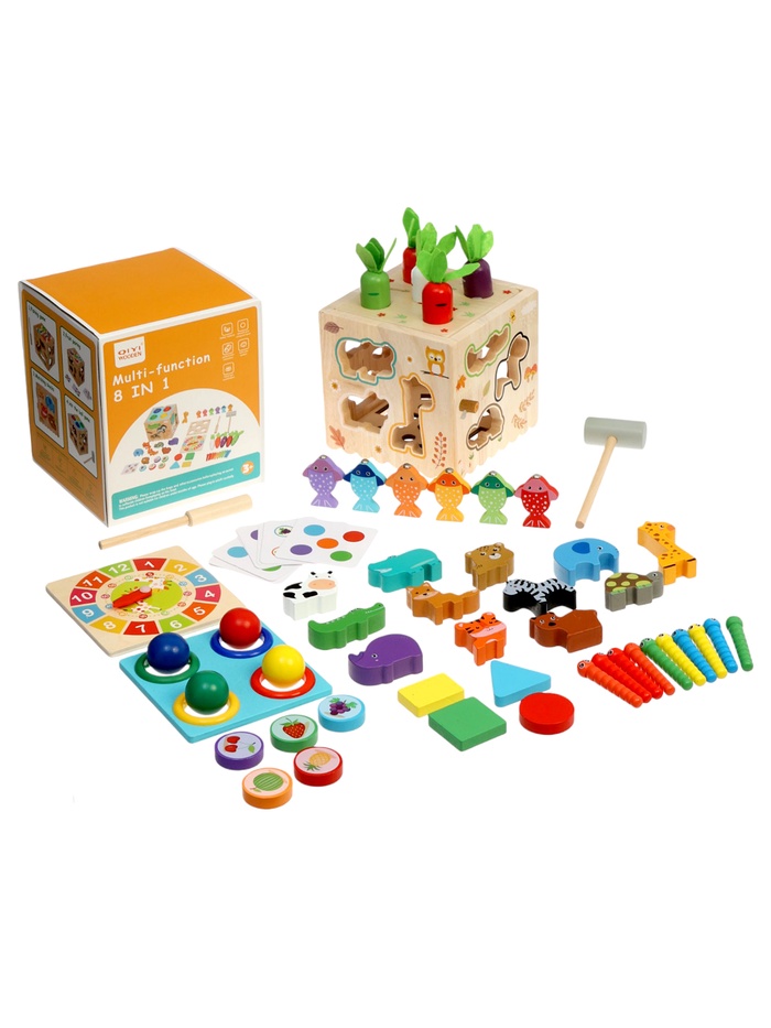 Деревянный сортер 8 в 1 — многофункциональный развивающий центр, который сочетает игры на сортировку, ловлю, счёт, логику, моторику и знакомство с формами, цветами и животными. Каждая грань куба — отдельная активность, поэтому ребёнок надолго увлекается процессом и одновременно тренирует несколько навыков.