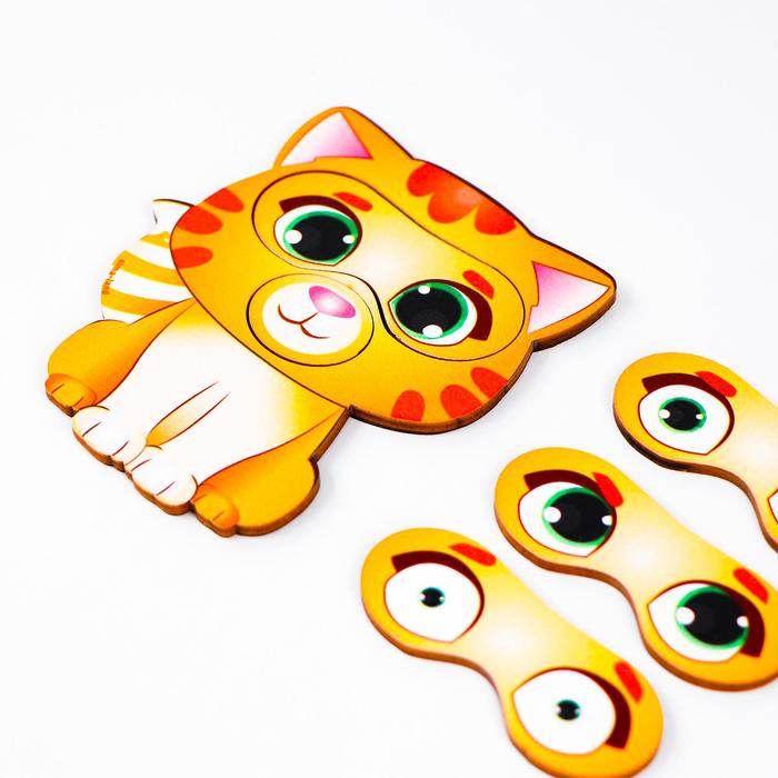 Разложите перед ребёнком глазки котёнка, пусть он попробует сам назвать эмоции. Затем зачитайте текст карточки и попросите малыша вставить нужную эмоцию котёнку.