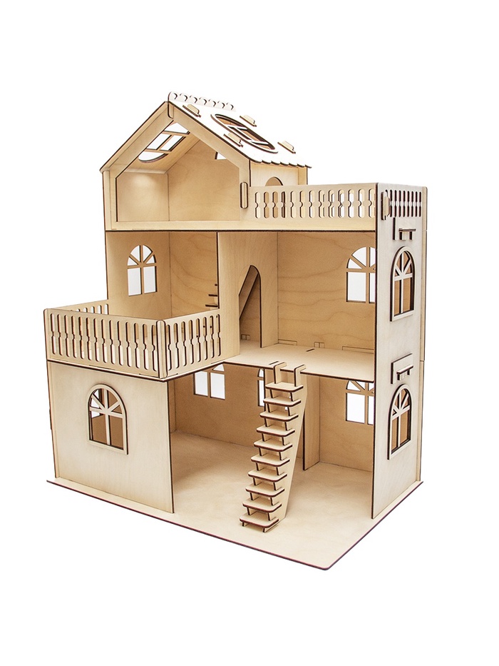 Игровое пространство рождается из простых деревянных деталей. Кукольный дом трехэтажный деревянный создает основу для сюжетных игр, где ребенок сам придумывает истории и наполняет комнаты персонажами.