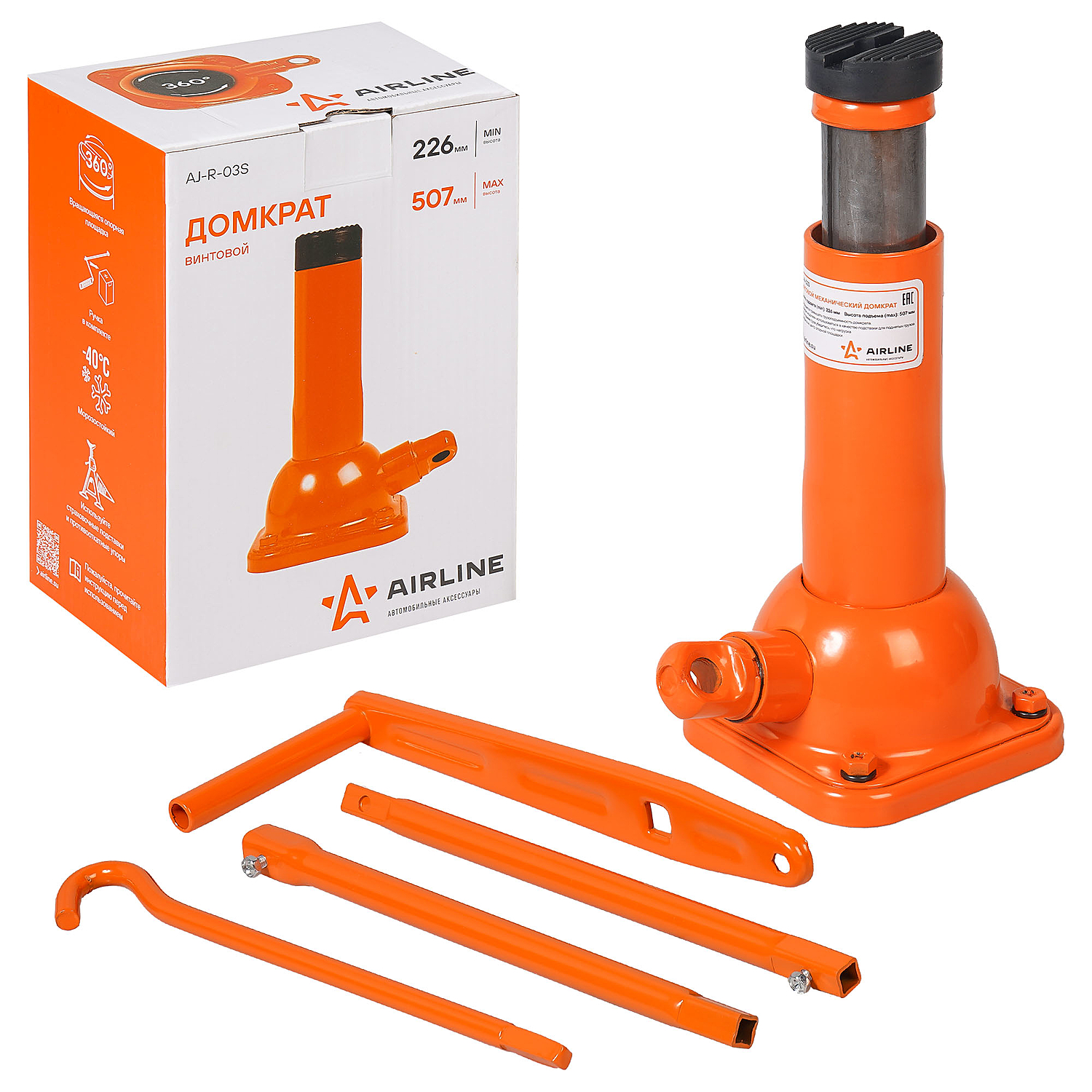 Винтовой домкрат — это простой и надежный подъемный механизм, который неприхотлив в обслуживании. Благодаря своим небольшим габаритам может храниться в узком отсеке багажника и использоваться в полевых условиях. Из-за отсутствия гидравлической жидкости возможна транспортировка и хранение в любом положении. Так же винтовой домкрат сохраняет работоспособность при отрицательных температурах. Достоинством домкрата AIRLINE является ручка разборной конструкции, которая помещается в упаковку с домкратом. На отдельных моделях присутствуют прорезиненные площадки (седло).