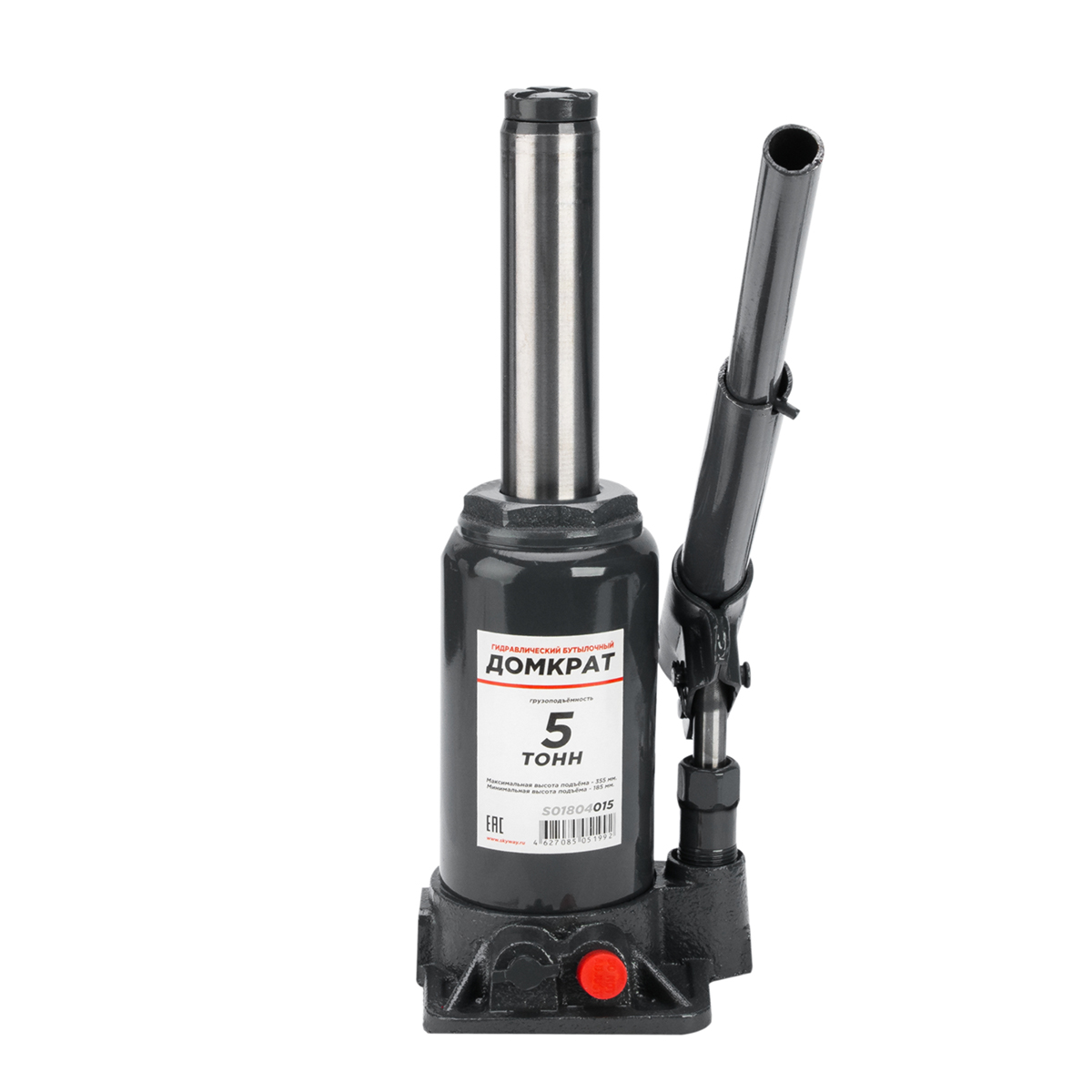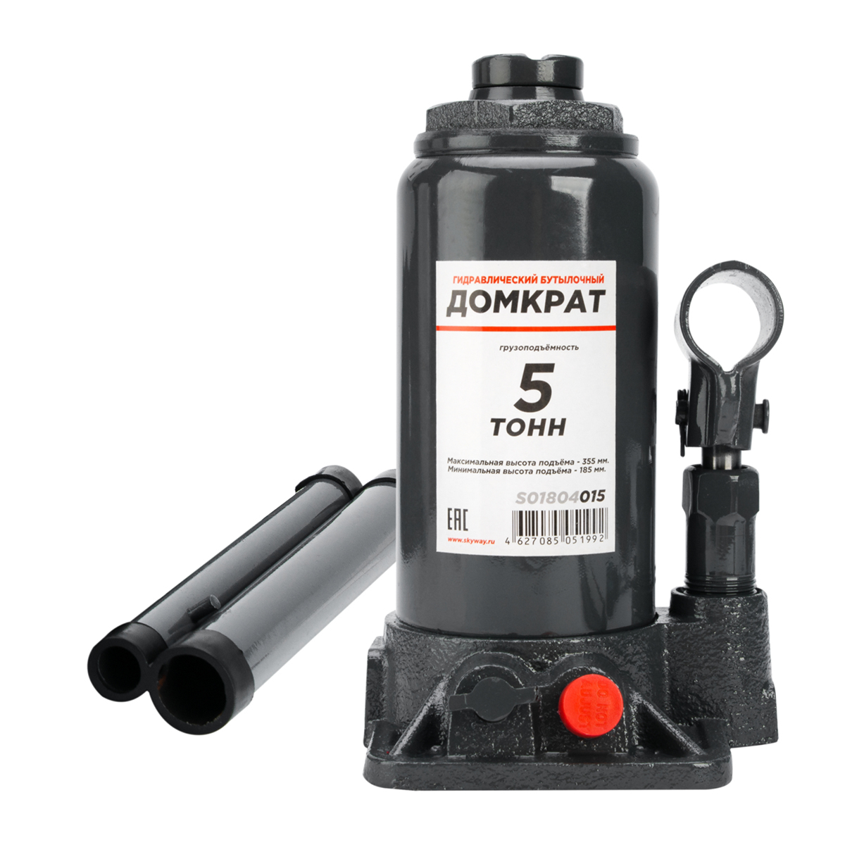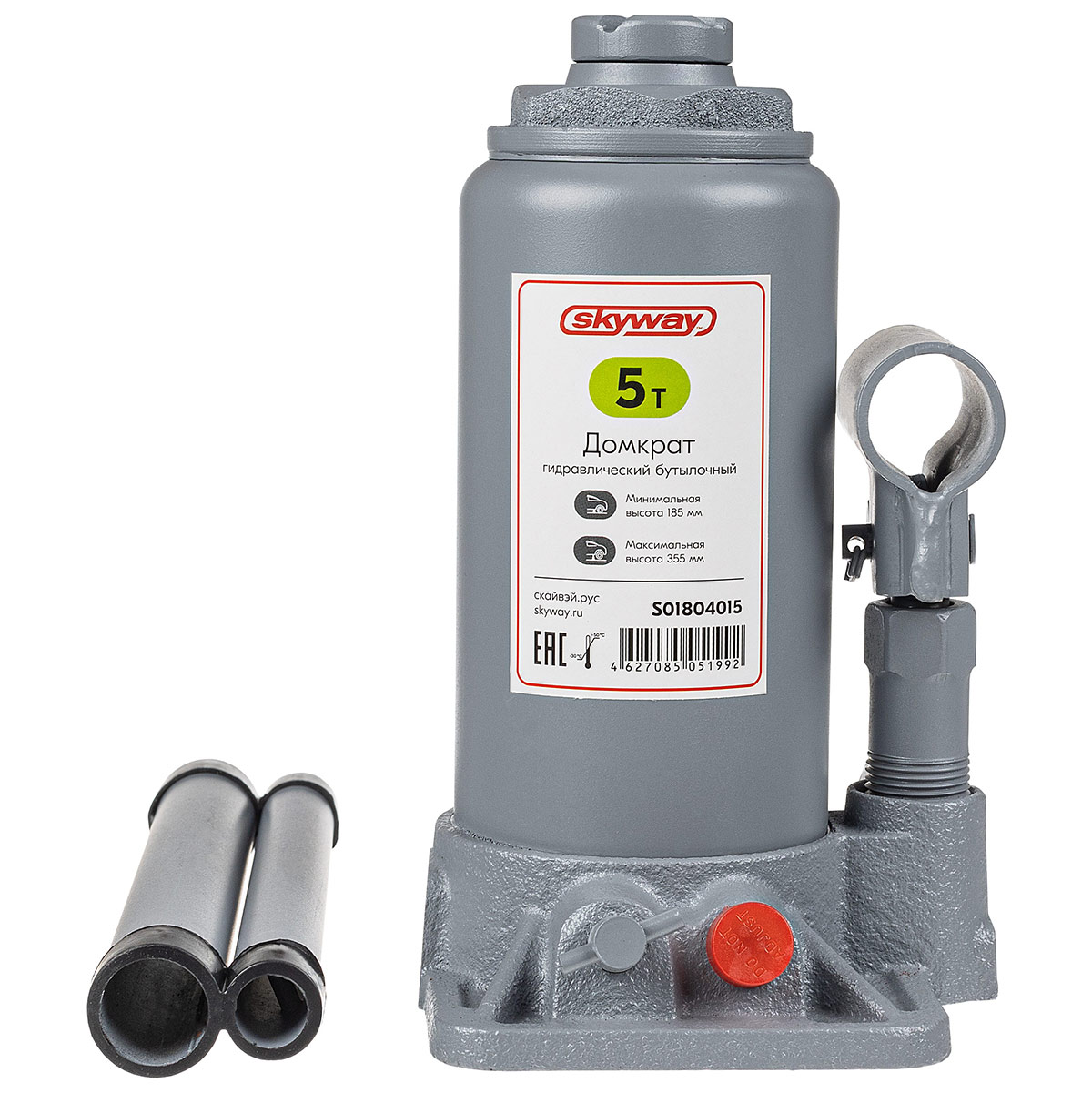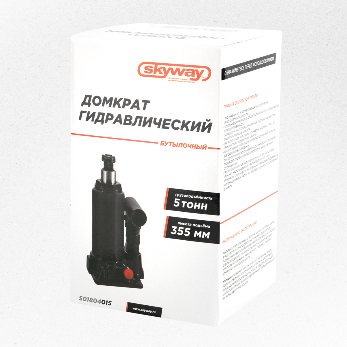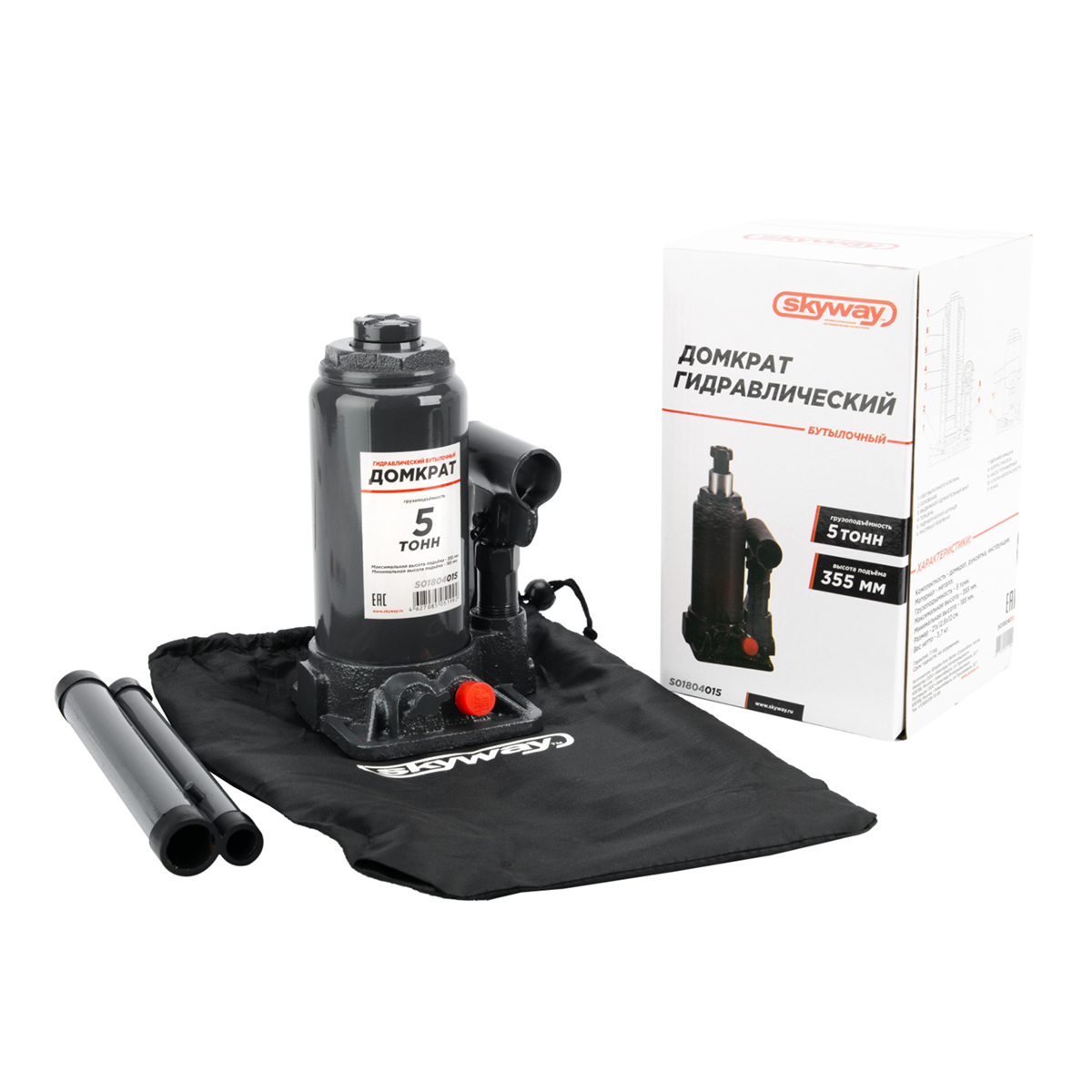Домкрат гидравлический бутылочный 5т h 185-355мм SKYWAY с клапаном в коробке+сумка - полностью металлическая конструкция узлов и агрегатов обеспечивает высокую надежность и отказоустойчивость. Перепускной клапан предохраняет домкрат от поломки, если вес груза превышает грузоподъемность домкрата.