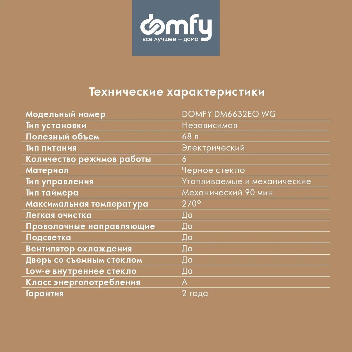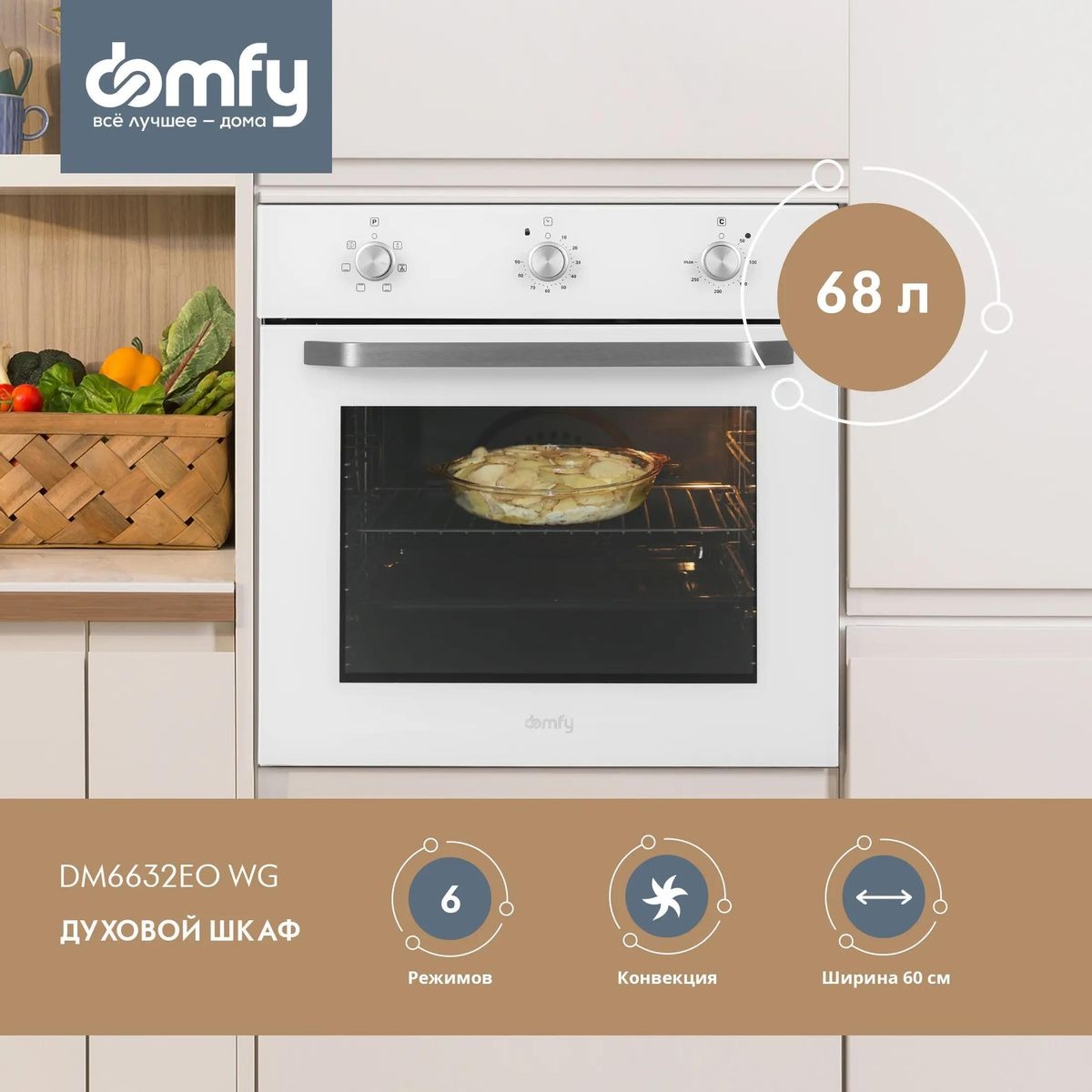 Встраиваемый электрический духовой шкаф DOMFY DM6632EO WG обладает впечатляющими характеристиками и станет отличным помощником на любой кухне. Внутренний объем 68 литров отлично подходит для приготовления блюд на большое количество персон.