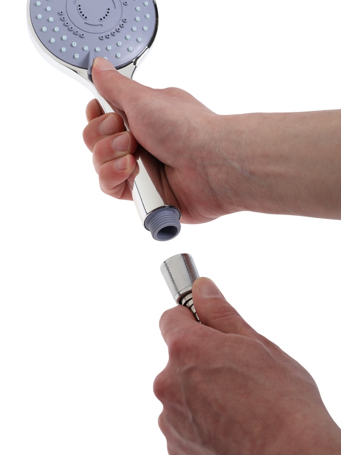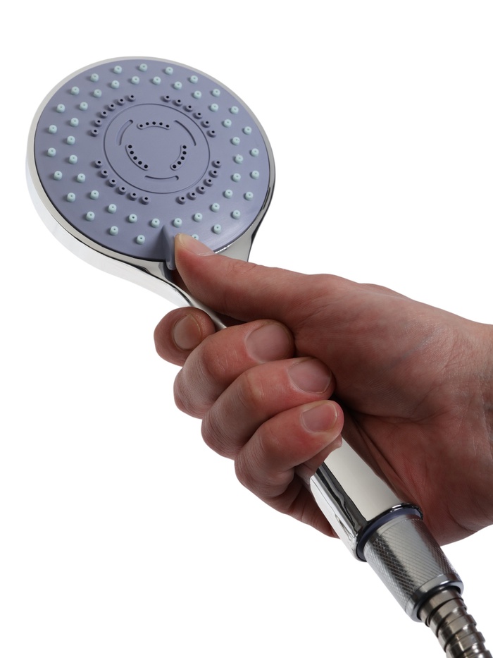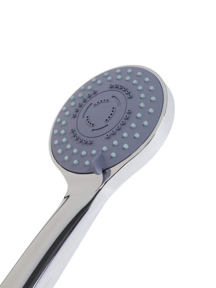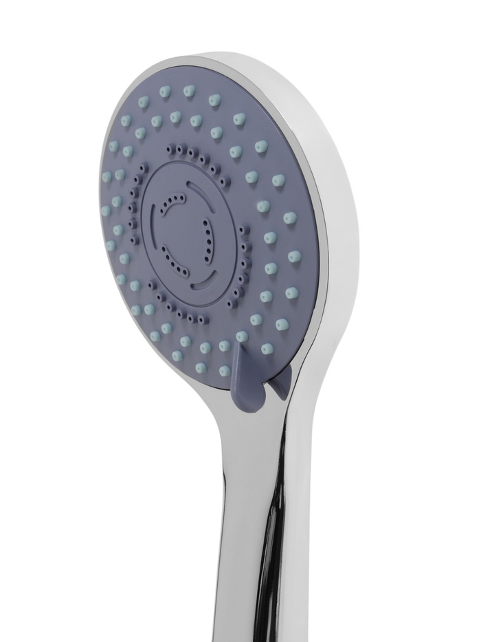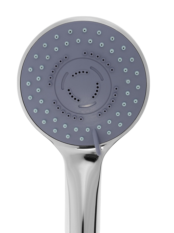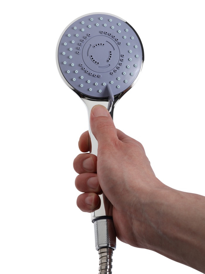 Лейка имеет круглую форму и выполнена из ABS-пластика. Встроенный в душевую лейку переключатель потока воды дает возможность изменять мощность струи и оптимизировать расход воды. Настенный кронштейн для лейки — неповоротный. Шланг изготовлен из нержавеющей стали.