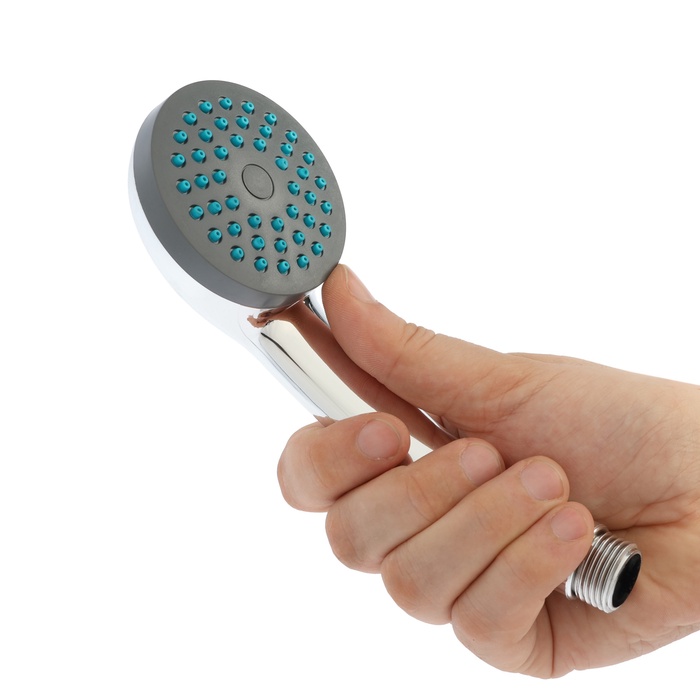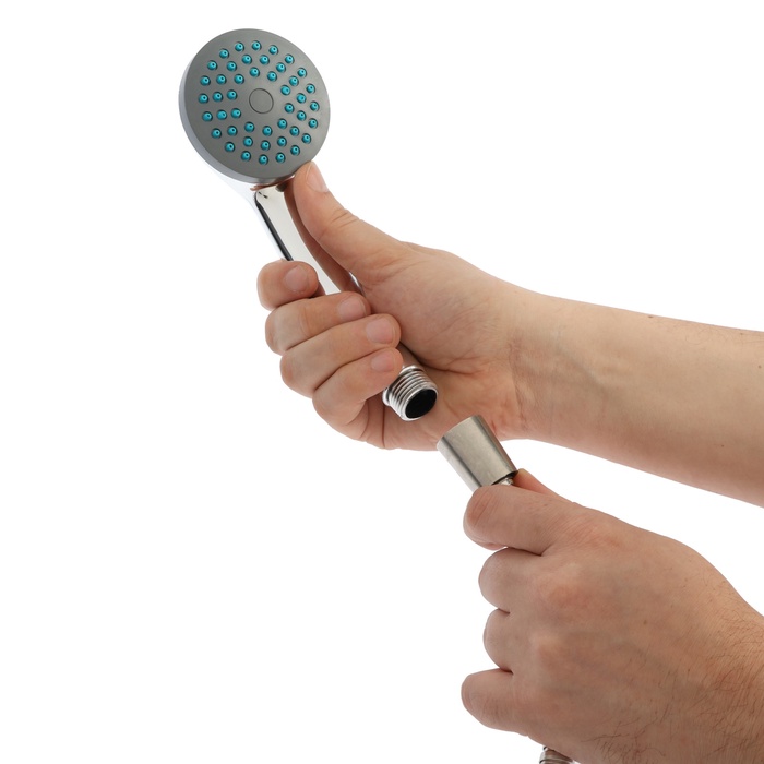В комплект входят душевая лейка, шланг и держатель. Лейка имеет круглую форму и выполнена из ABS-пластика. Шланг изготовлен из нержавеющей стали, крепится на гайки. Настенный кронштейн для лейки — неповоротный.