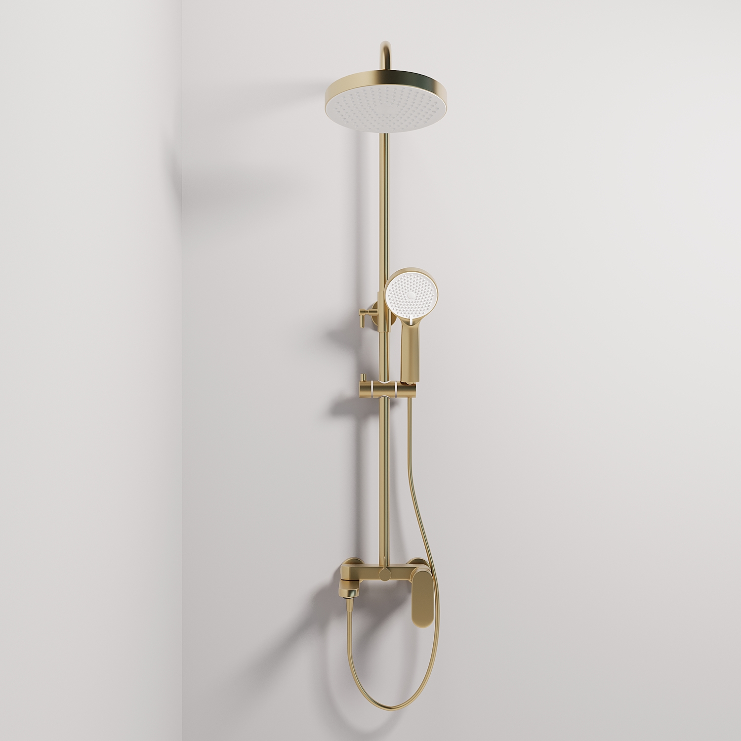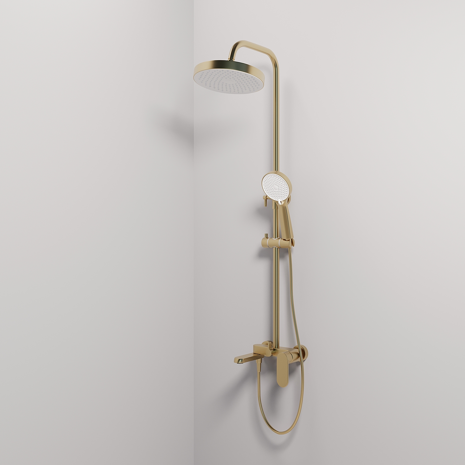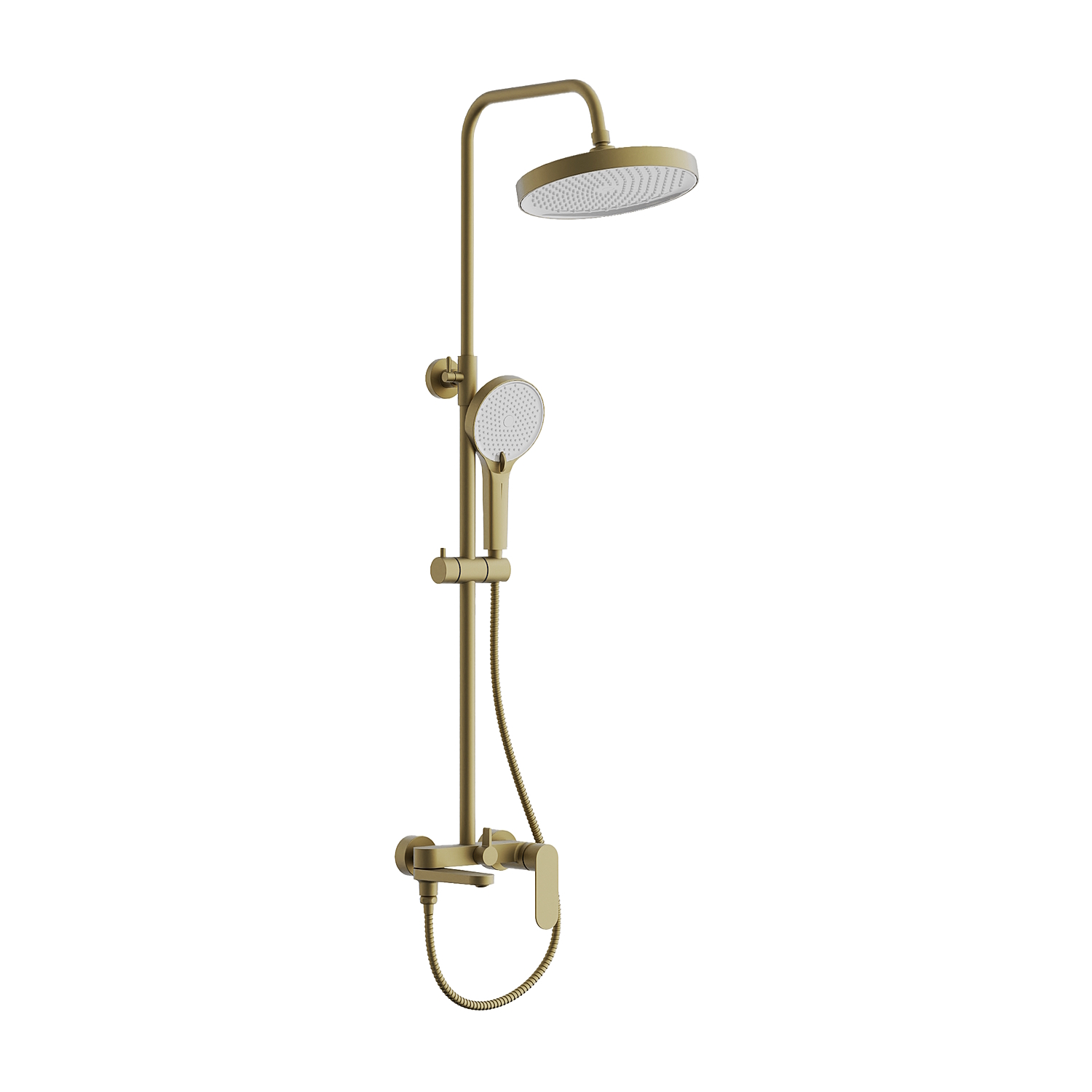 Душевая система AVRORA Rumy AV5940Gold золото — роскошная модель в золотистом исполнении, придающая интерьеру изысканность и статусность. Изготовлена из высококачественных материалов с устойчивым PVD‑покрытием. В комплект входят поворотный излив, большой верхний душ, ручная лейка с многофункциональными режимами и регулируемая штанга. Однорычажное управление с керамическим картриджем обеспечивает удобство эксплуатации. Шланг длиной 1500 мм имеет антитвистовую защиту. Золотистый оттенок гармонично сочетается с современными и классическими стилями оформления ванной комнаты.