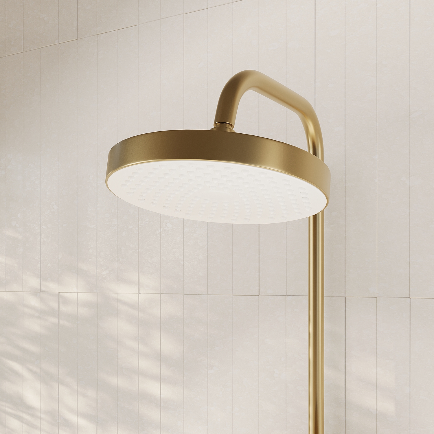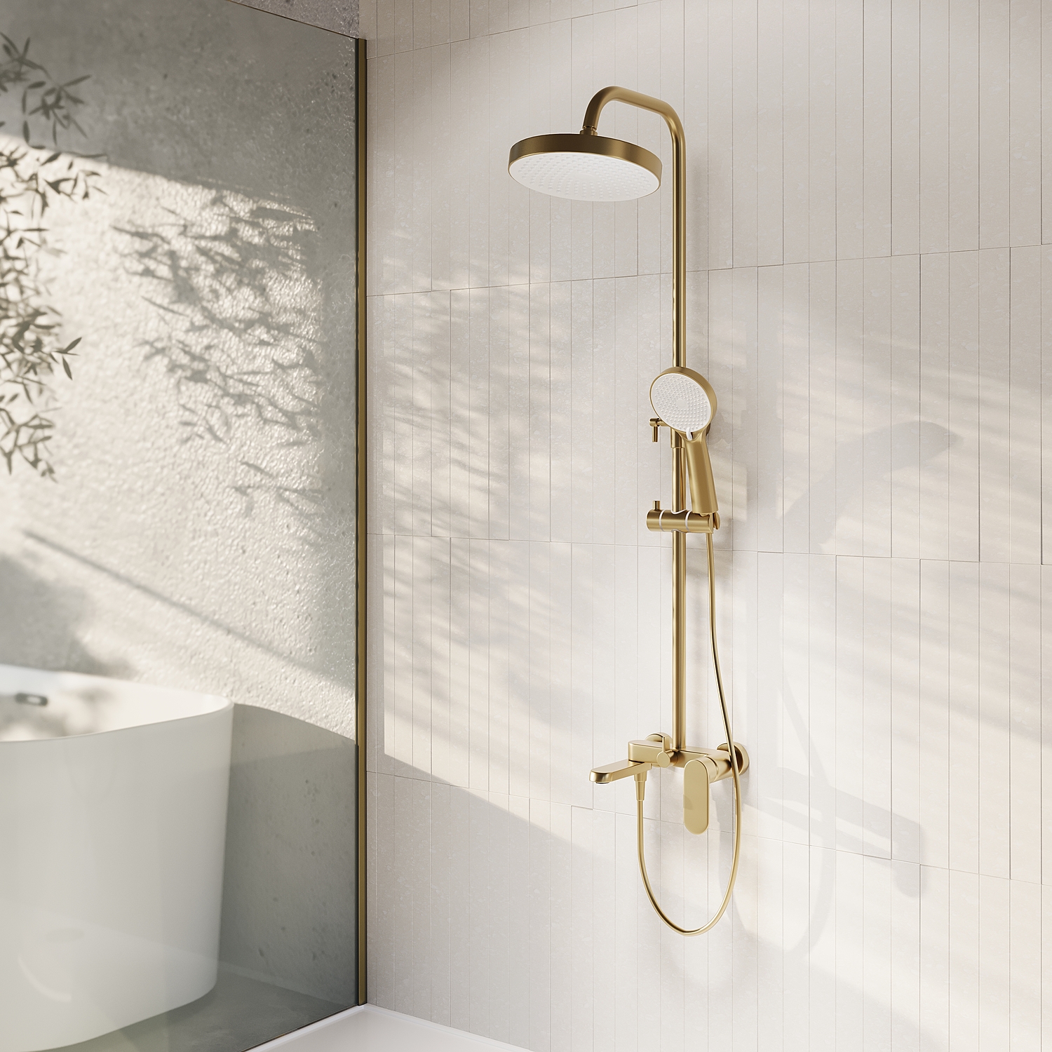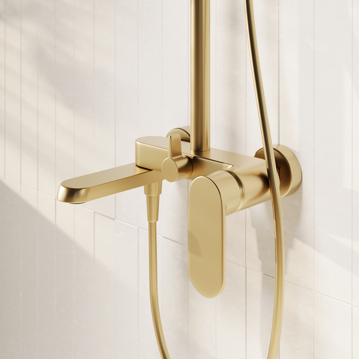 Душевая система AVRORA Rumy AV5940Gold золото — роскошная модель в золотистом исполнении, придающая интерьеру изысканность и статусность. Изготовлена из высококачественных материалов с устойчивым PVD‑покрытием. В комплект входят поворотный излив, большой верхний душ, ручная лейка с многофункциональными режимами и регулируемая штанга. Однорычажное управление с керамическим картриджем обеспечивает удобство эксплуатации. Шланг длиной 1500 мм имеет антитвистовую защиту. Золотистый оттенок гармонично сочетается с современными и классическими стилями оформления ванной комнаты.
