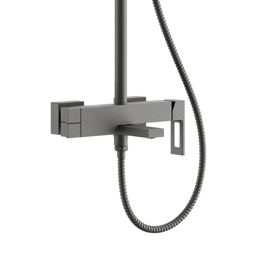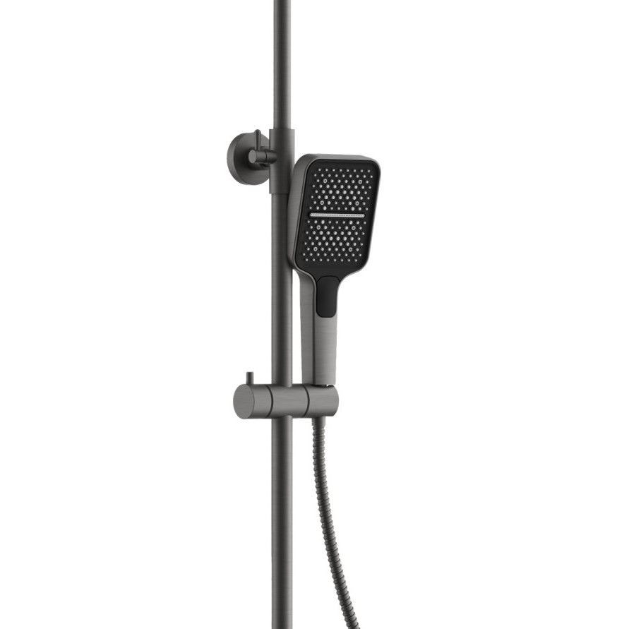 Душевая лейка (ручной душ) также изготовлена из ABS-пластика и оснащена силиконовыми форсунками. Она регулируется как по высоте, так и по наклону благодаря подвижному держателю на штанге. Душевая система комплектуется шлангом в двойной металлической оплётке длиной 150 см, что обеспечивает его прочность и долговечность.