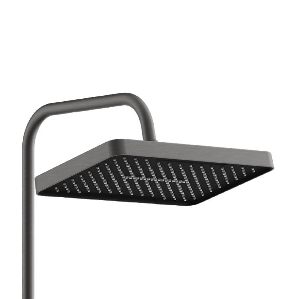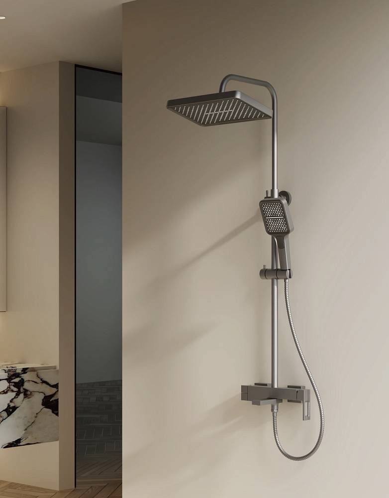 Излив душевой системы оснащён аэратором и в сложенном состоянии служит переключателем потока воды, что добавляет удобства в использовании. Верхний душ размером 320х210 мм изготовлен из ABS-пластика и оснащён силиконовыми форсунками, которые легко очищаются от известкового налёта. Благодаря шарниру верхний душ можно регулировать по наклону вдоль всей оси, а его высота настраивается с помощью телескопической конструкции штанги.