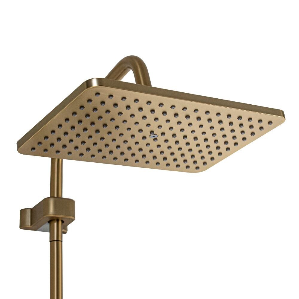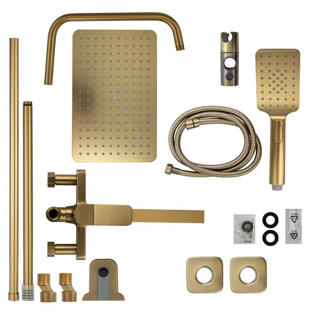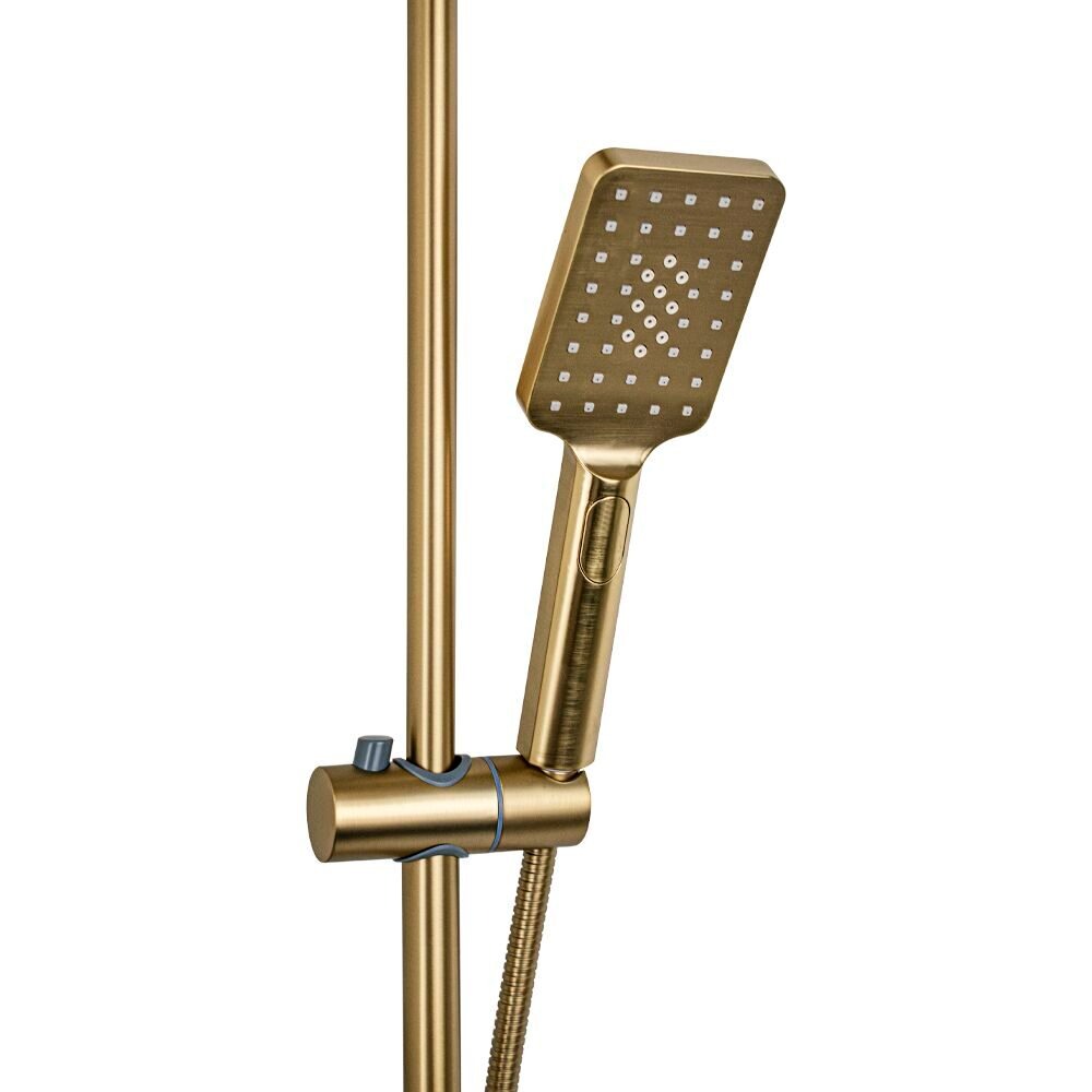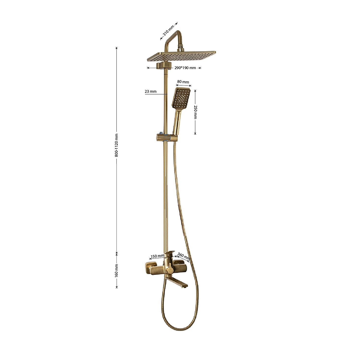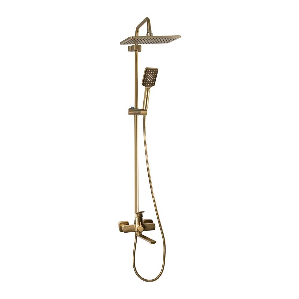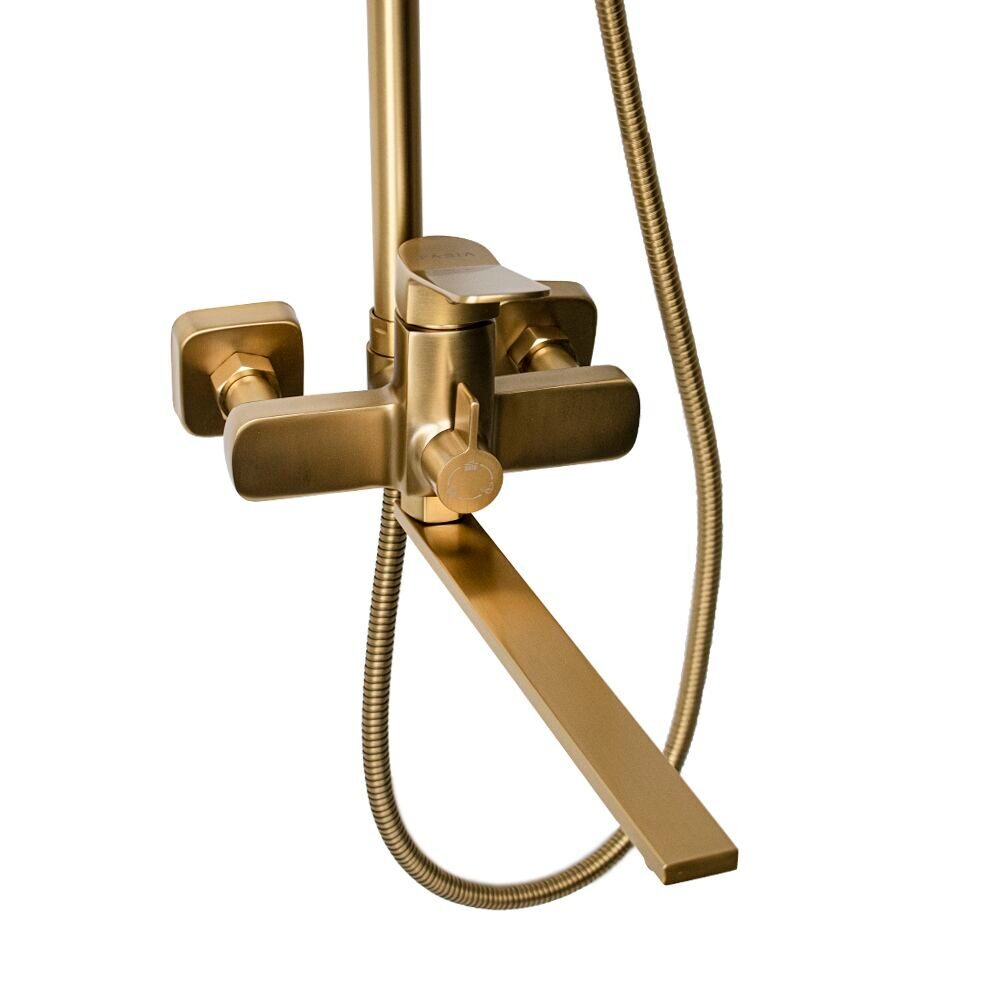 Душевая система Fabia 9878 в цвете «матовое золото» представляет собой стильное и функциональное решение для ванной комнаты, объединяющее современный дизайн и практичность. Система включает шаровый смеситель с длинным поворотным изливом (длина излива корпуса — 340 мм), обеспечивающий удобство при наполнении ванны. В комплект входит телескопическая стойка с регулировкой высоты (800–1100 мм), которая крепится к корпусу смесителя и дополнительно фиксируется на стене. Душевая система оснащена двумя лейками: большой круглой лейкой для эффекта «тропического душа» (диаметр — 255 мм) и дополнительной душевой лейкой (диаметр — 190 мм). Для подключения предусмотрен шланг длиной 150 см. Управление осуществляется посредством однорычажного механизма с 40‑мм керамическим картриджем, обеспечивающим плавное регулирование температуры и напора воды; также имеется дивертор с тремя положениями для переключения режимов. Для экономии воды предусмотрен аэратор. Система изготовлена из латуни, что гарантирует прочность и устойчивость к коррозии. В комплект поставки входят: корпус с изливом, чашки, эксцентрики, прокладки, стойка, дивертор, шланг, две лейки и крепления.