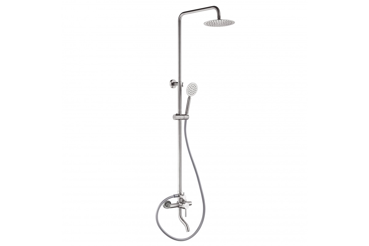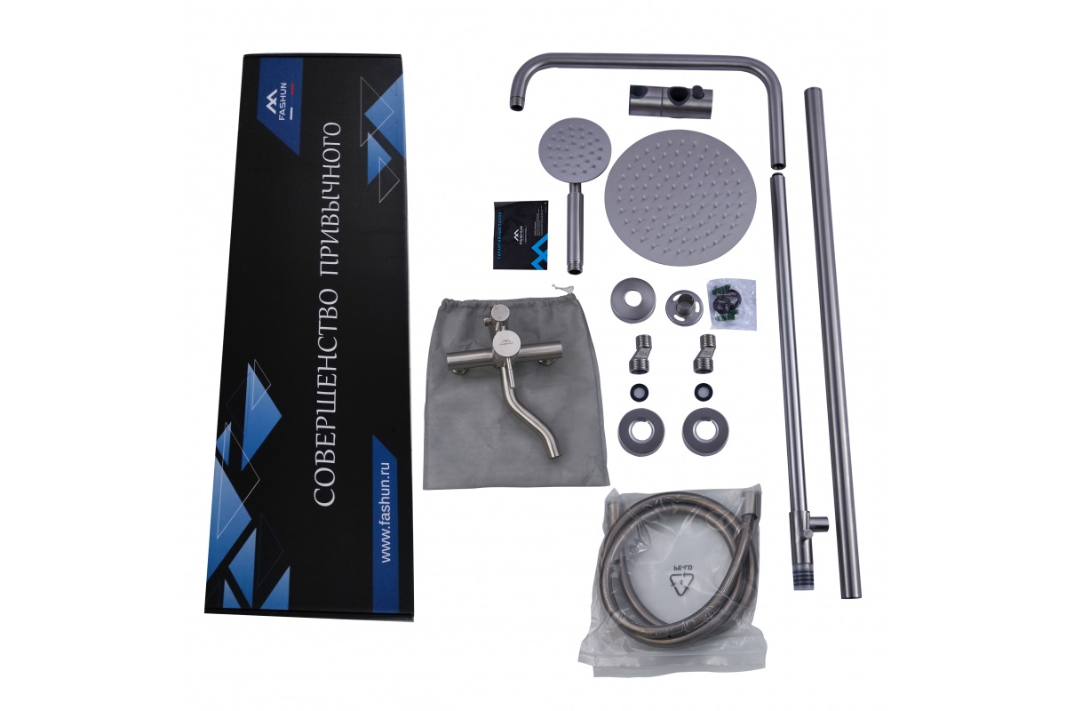 Душевая стойка Fashun A52409 выполнена в сатиновом исполнении. Материалы, использованные в конструкции: смеситель из стали SUS304, штанга из стали SUS304, верхняя и ручная лейка из стали SUS304 и оплётка шланга из PVC. Места соединений шланга с лейкой и смесителем оснащены поворотным конусом или специальными подшипниками, которые препятствуют перекручиванию шланга. В комплект входят душевой шланг, душевая лейка, держатель для душа и эксцентрики.