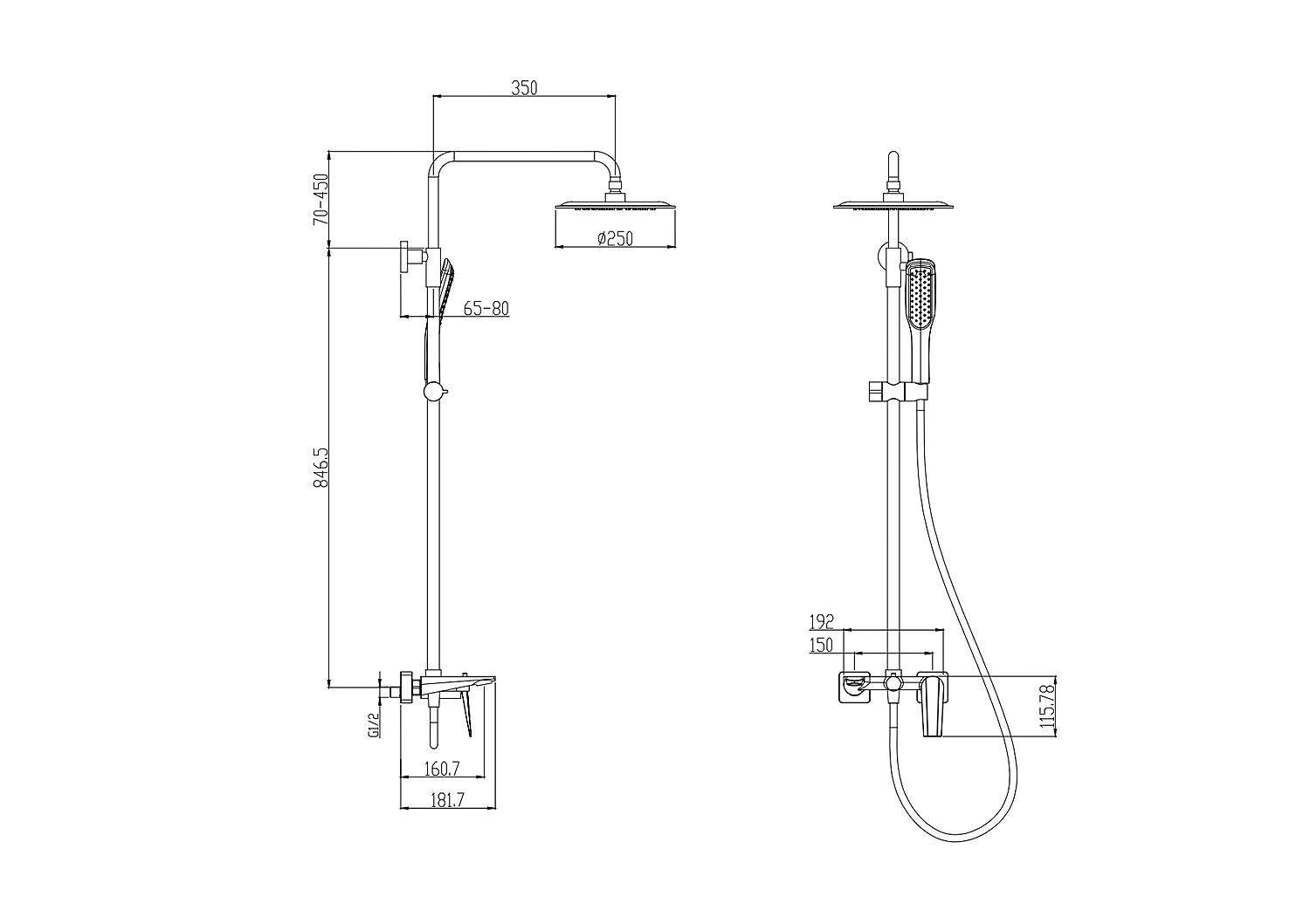 Вертикальная конструкция душевой стойки экономит пространство и обеспечивает удобство использования. Крупная верхняя лейка диаметром 250 мм создаёт мягкий, равномерный и мощный поток воды, обеспечивая настоящий релакс после напряженного дня. Ручной душ оснащён форсунками легкой очистки. Длина шланга душевой лейки — 1500 мм.