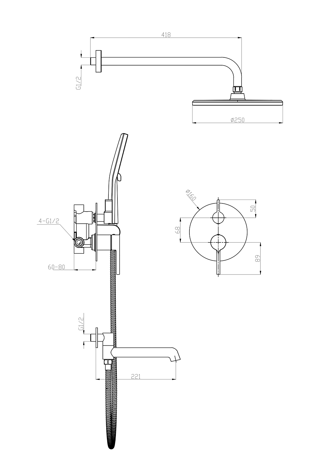 Управление системой осуществляется с помощью однорычажного механизма с керамическим картриджем диаметром 35 мм — это обеспечивает плавный ход рычага и точный контроль температуры и напора воды. В комплект входит верхний душ круглой формы диаметром 250 мм, создающий равномерный поток воды. Ручной душ тоже круглый, оснащён тремя режимами струи — переключение выполняется кнопкой. Душевой шланг длиной 1500 мм изготовлен из металла и имеет защиту от перекручивания. Для наполнения ванны предусмотрен поворотный излив длиной 221 мм. Аэратор системы смягчает поток воды, обеспечивает её равномерную подачу и фильтрует примеси.