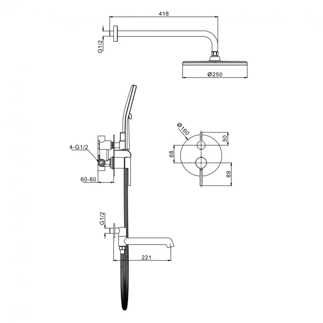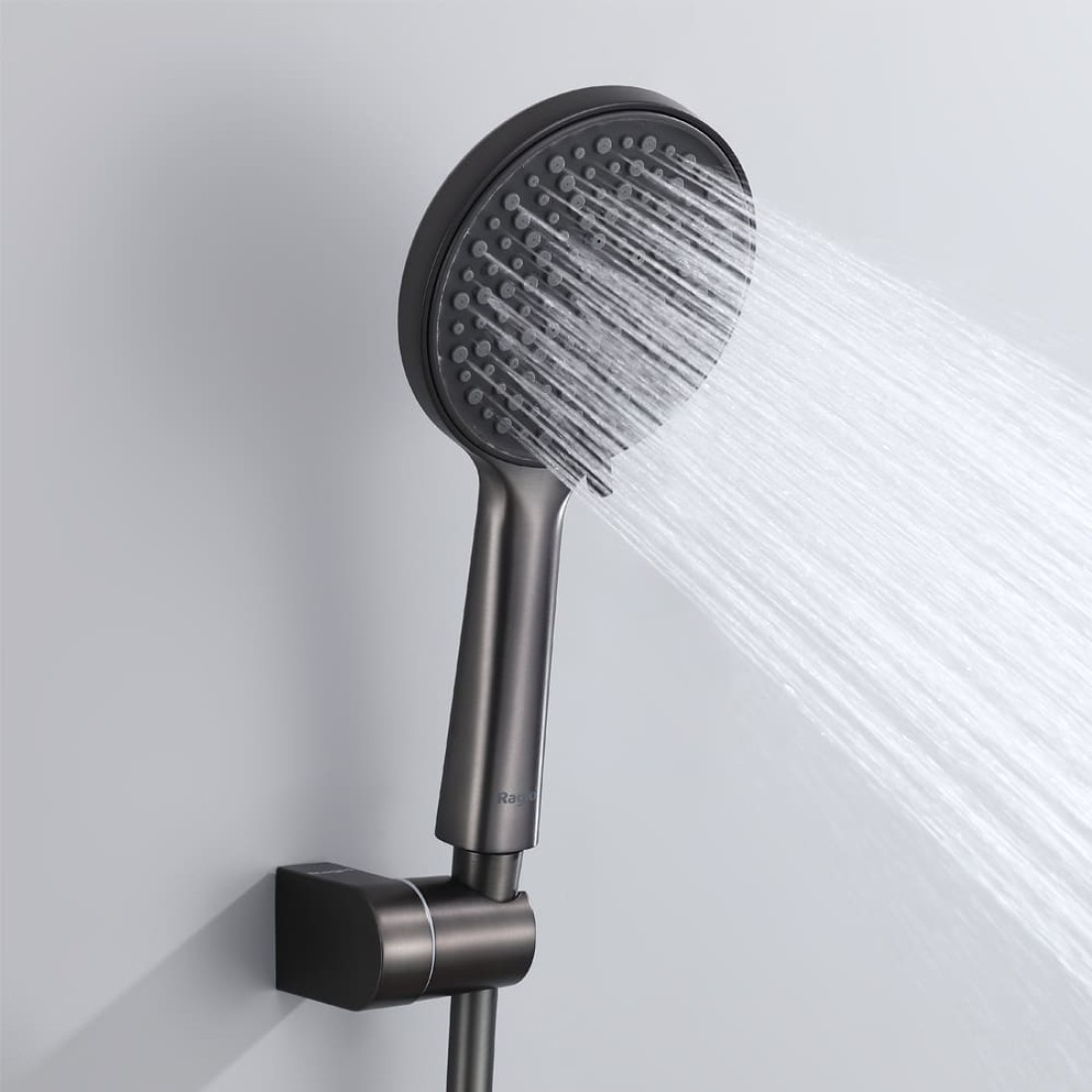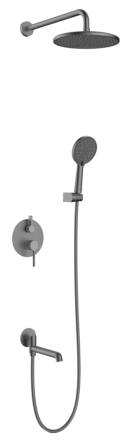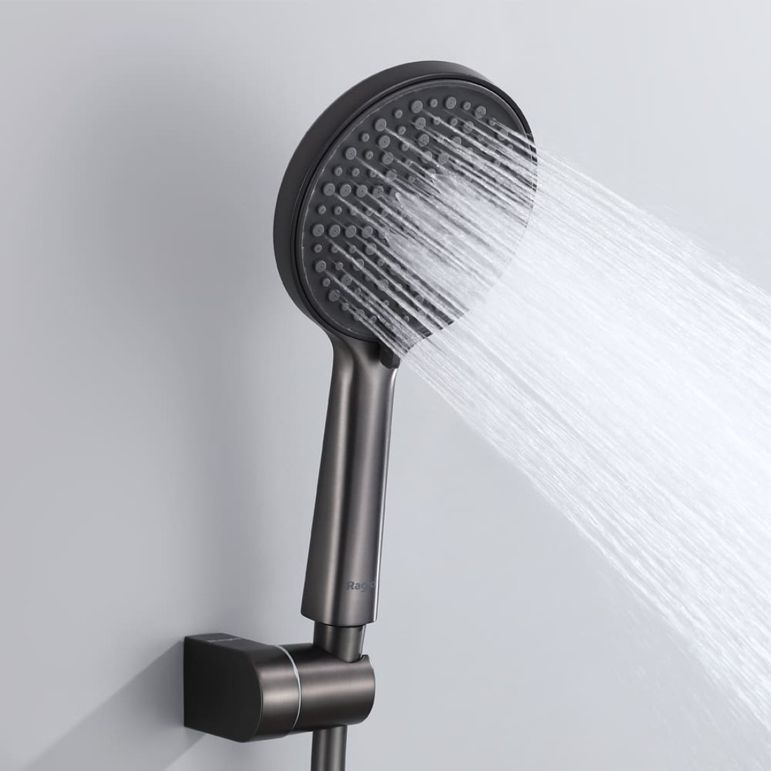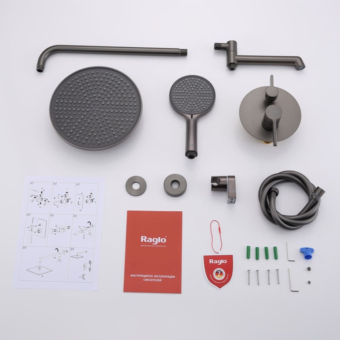 Душевая система Raglo R20.27.09 в графитовом исполнении представляет собой встраиваемую модель, выполненную из прочной латуни с матовым графитовым покрытием, которое придаёт системе стильный современный вид и хорошо сочетается с разными интерьерами. Система оснащена однорычажным управлением с керамическим картриджем, обеспечивающим плавное и точное регулирование температуры и напора воды. В комплект входит верхний душ круглой формы диаметром 250 мм, создающий равномерный поток воды, имитирующий тропический дождь, а также ручной душ круглой формы с тремя режимами струи (переключение кнопкой). Душевой шланг длиной 1500 мм изготовлен из металла и имеет защиту от перекручивания. Для удобства наполнения ванны предусмотрен поворотный излив с функцией переключения. Аэратор системы смягчает поток воды, обеспечивает её равномерную подачу и фильтрует примеси. Монтаж выполняется встраиваемым способом — внутренние элементы скрываются в стене, снаружи остаются только функциональные части. Для подключения используется стандартная подводка G 1/2 (½ дюйма). Габариты системы: глубина — 500 мм, длина излива — 221 мм, общий вес комплекта — 4 кг. В поставку входят смеситель (внешняя и внутренняя часть), верхний душ с кронштейном, ручной душ с лейкой, душевой шланг, настенный держатель для лейки, поворотный излив, сантехнические эксцентрики и отражатели, ключ для аэратора, а также паспорт изделия, инструкция по монтажу и гарантийный талон.