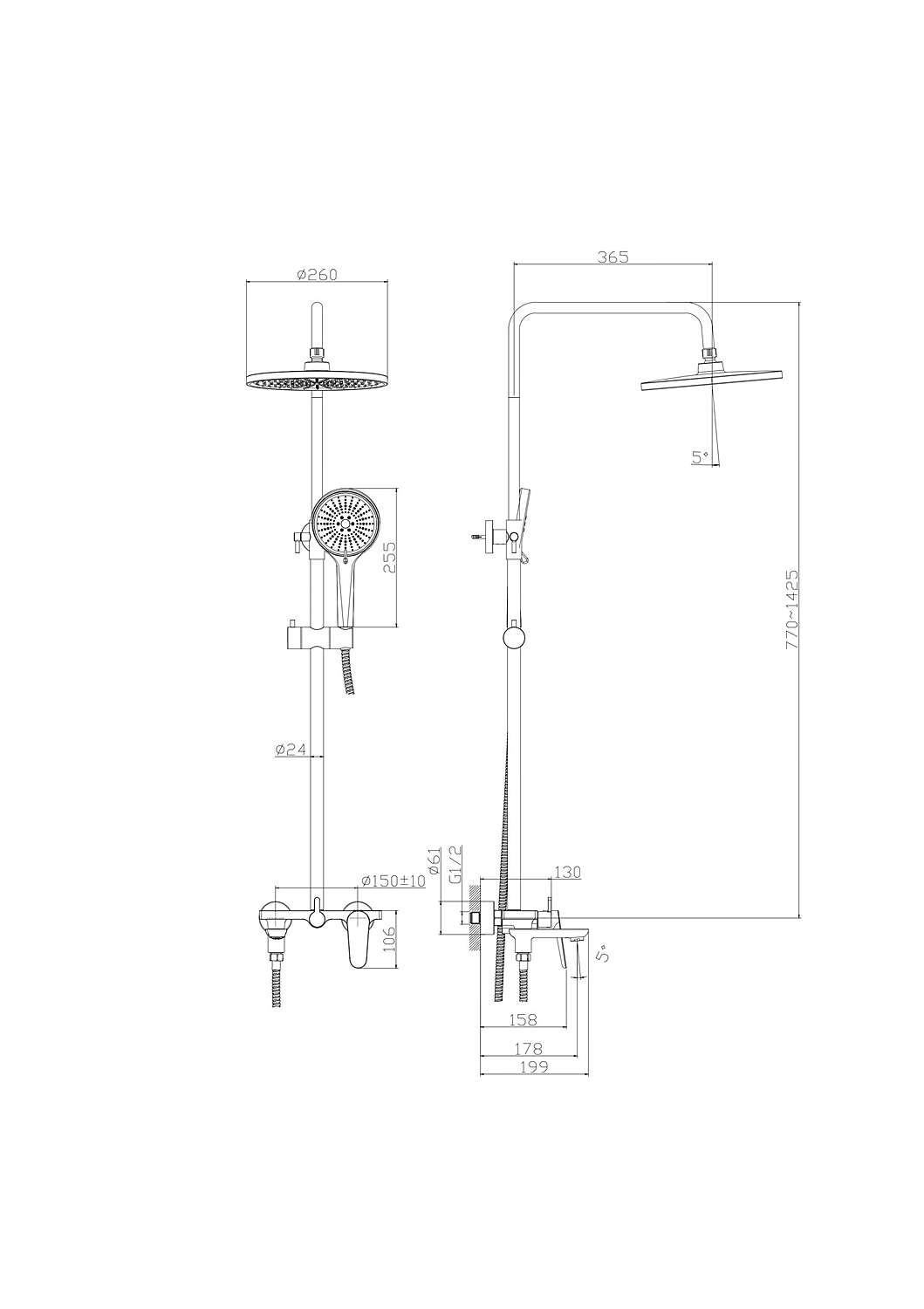 Управление системой осуществляется с помощью однорычажного механизма с керамическим картриджем диаметром 35 мм. Это гарантирует плавную и точную регулировку температуры и напора воды. Верхний душ круглой формы (диаметр 260 мм) создаёт эффект тропического дождя за счёт равномерного распределения потока. Высота штанги регулируется в диапазоне от 770 до 1425 мм, что позволяет настроить положение душа под рост пользователей.