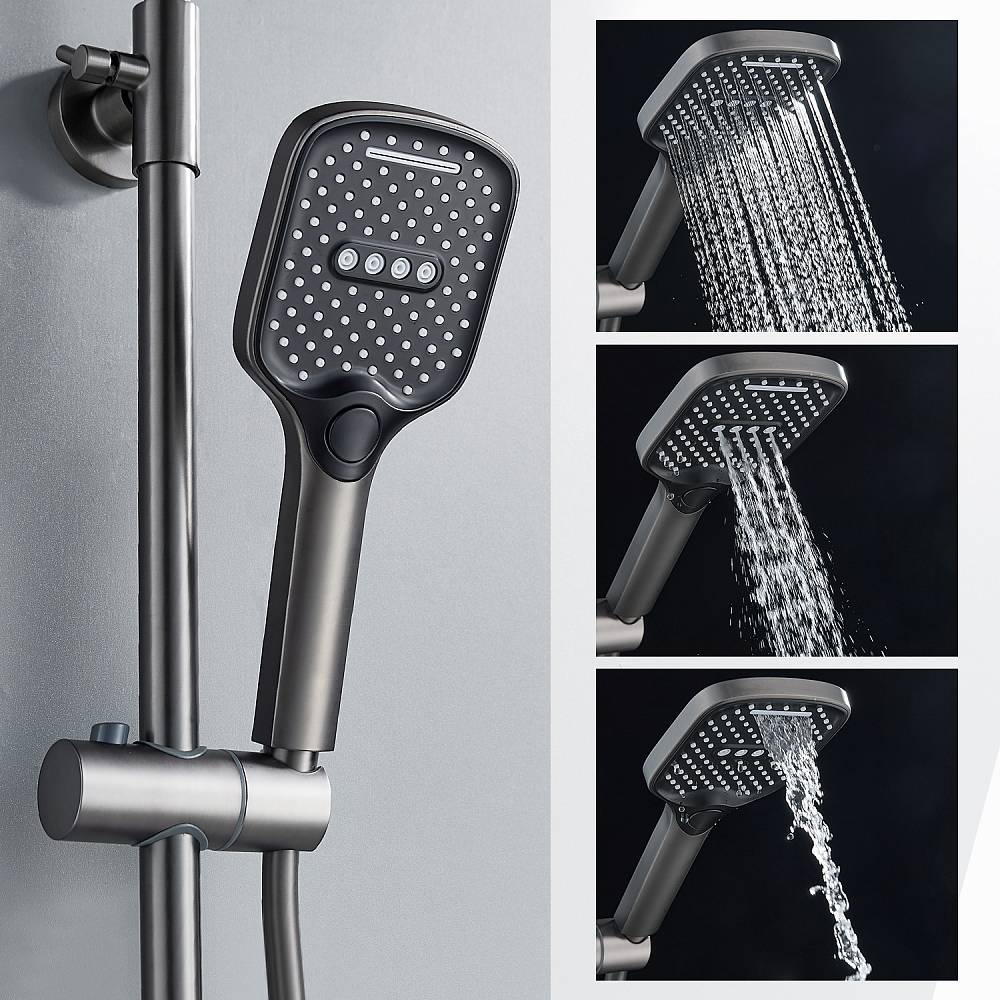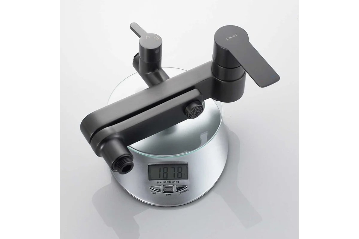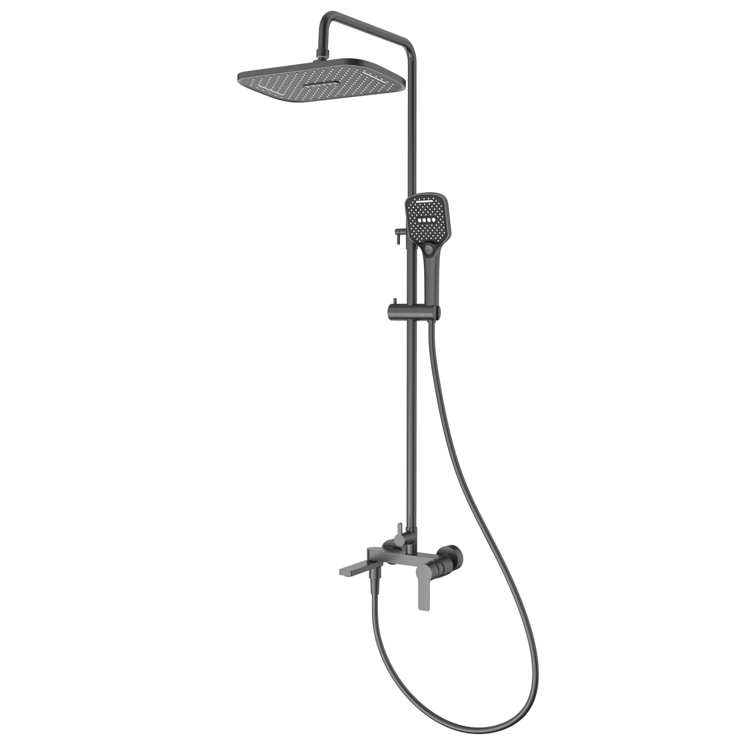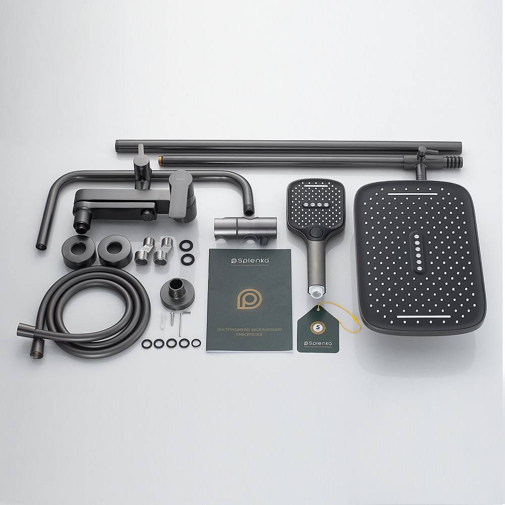 Душевая система Splenka S06.24.09 в цвете «графит» — это настенная модель с однорычажным управлением, отличающаяся лаконичным дизайном и надёжностью. Основа из латуни гарантирует прочность и устойчивость к износу. Керамический картридж обеспечивает плавное регулирование температуры и напора воды. В комплект входят: прямоугольный верхний душ (320 × 210 мм), ручной душ с тремя режимами струи (переключение кнопкой), металлический шланг 1,5 м, регулируемая штанга, держатель ручного душа и монтажные элементы (эксцентрики с отражателями). Излив каскадного типа имеет поворотную конструкцию длиной 18,2 см. Система оснащена аэратором для равномерного потока воды и антиизвестковым покрытием, упрощающим уход. Высота конструкции — 151 см, вылет верхнего душа — 42 см. Стандарт подводки — G 1/2, пропускная способность — до 48 л/мин.