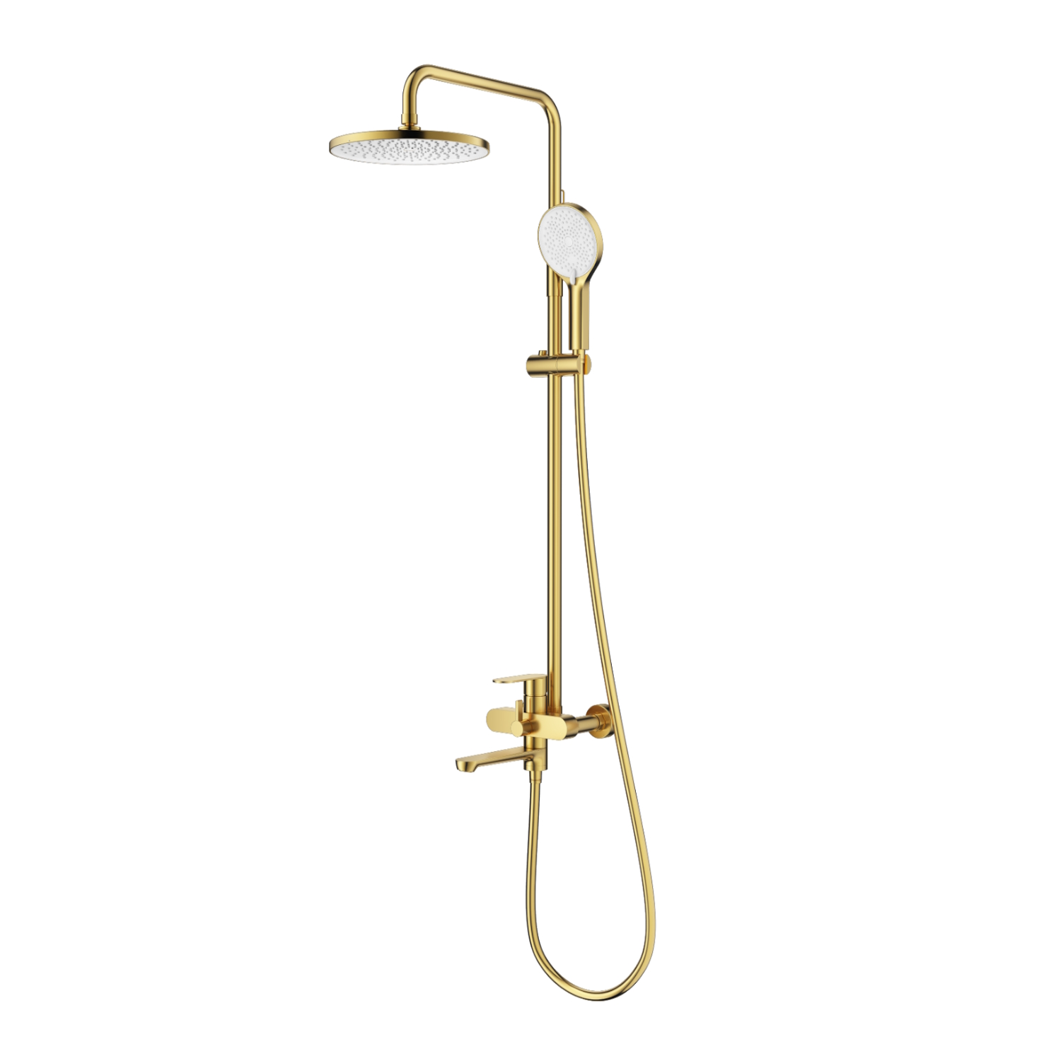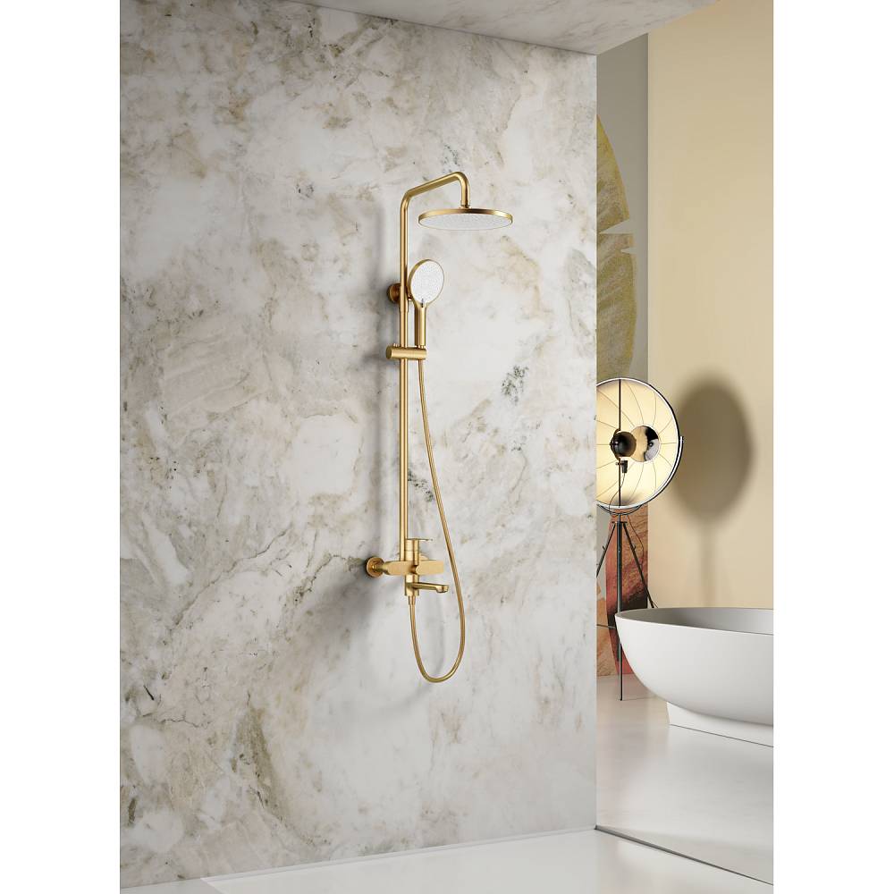 Душевая система Splenka S222.24.03 в цвете «сатин золотой» — это настенная конструкция с однорычажным смесителем, сочетающая эстетику и функциональность. Основа из латуни гарантирует прочность и долговечность. Керамический картридж обеспечивает плавное регулирование температуры и напора воды. Комплектация включает: прямоугольный верхний душ (320 × 210 мм), ручной душ с тремя режимами струи (кнопочное переключение), металлический шланг 1,5 м, регулируемую штангу, держатель душа и монтажные элементы. Излив каскадного типа с поворотной конструкцией (18,2 см) подходит для наполнения ванны. Система оснащена аэратором и антиизвестковым покрытием, упрощающим уход. Высота конструкции — 151 см, вылет верхнего душа — 42 см. Подводка — G 1/2, пропускная способность — 48 л/мин.
