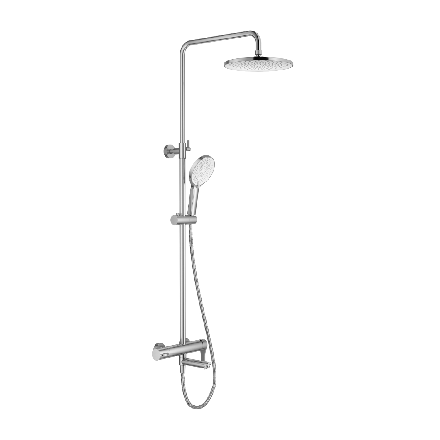 Душевая система Splenka S223.24.05 в цвете «сатин» представляет собой настенную конструкцию с однорычажным смесителем. Латунная основа обеспечивает надёжность и устойчивость к износу. Плавная регулировка температуры и напора осуществляется керамическим картриджем. В комплект входят: верхний душ прямоугольной формы (320 × 210 мм), ручной душ с тремя режимами струи (переключение кнопкой), металлический шланг длиной 1,5 м, регулируемая штанга, держатель для ручного душа и монтажные элементы. Излив каскадного типа с поворотной конструкцией (18,2 см) удобен для наполнения ванны. Система оборудована аэратором для равномерной подачи воды и имеет антиизвестковое покрытие поверхности. Высота — 151 см, вылет верхнего душа — 42 см. Стандарт подводки — G 1/2, пропускная способность — до 48 л/мин.