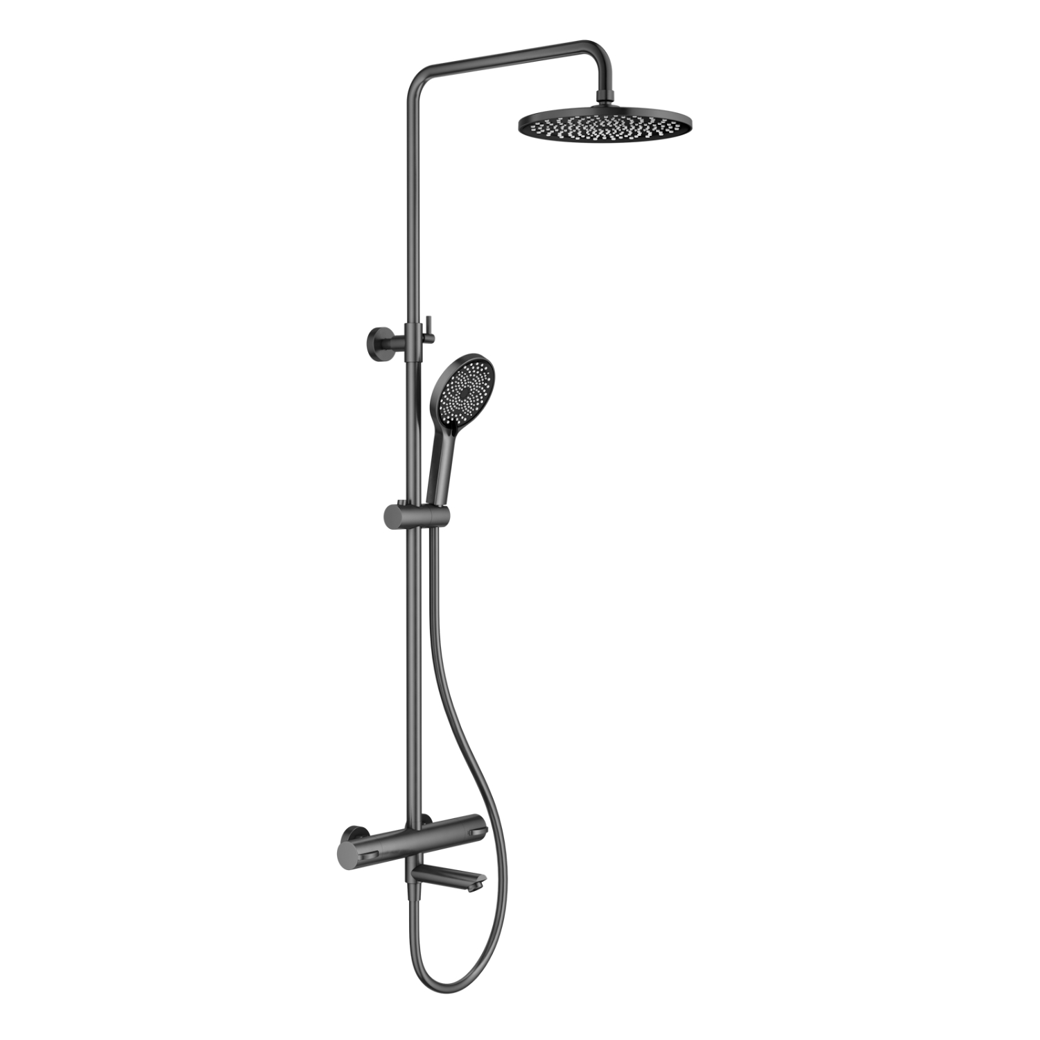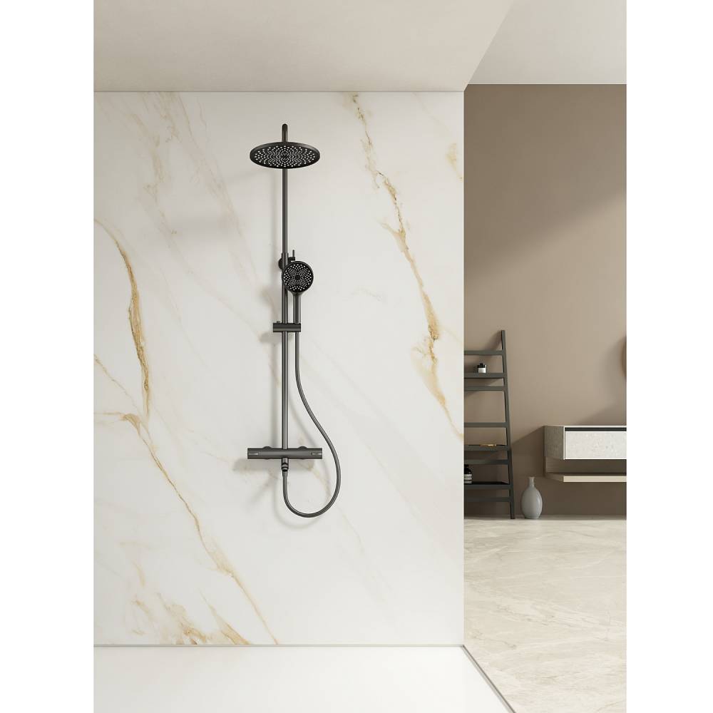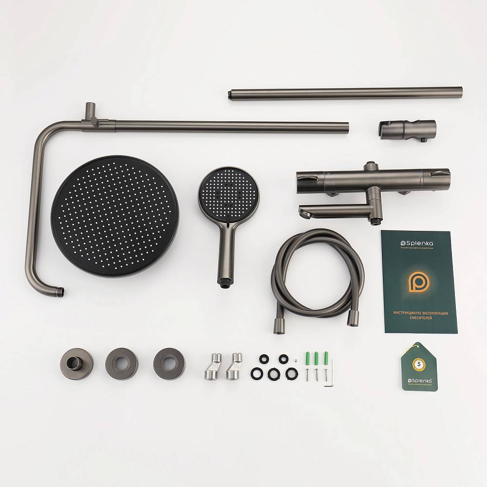 Душевая система Splenka S223.26.09 в цвете «графит» с термостатом обеспечивает безопасное и комфортное использование за счёт точной поддержки заданной температуры воды. Конструкция из латуни гарантирует долговечность и устойчивость к коррозии. Однорычажное управление позволяет регулировать напор, а термостат — фиксировать комфортную температуру. В комплект входят: верхний душ прямоугольной формы (320 × 210 мм), ручной душ с тремя режимами струи (переключение кнопкой), металлический шланг длиной 1,5 м, регулируемая по высоте штанга (860–1480 мм), держатель ручного душа и монтажные элементы. Излив каскадного типа имеет поворотную конструкцию (длина 18,2 см). Система оснащена аэратором для равномерного потока и антиизвестковым покрытием поверхности. Высота конструкции — 151 см, вылет верхнего душа — 42 см. Стандарт подводки — G 1/2, пропускная способность — до 48 л/мин.