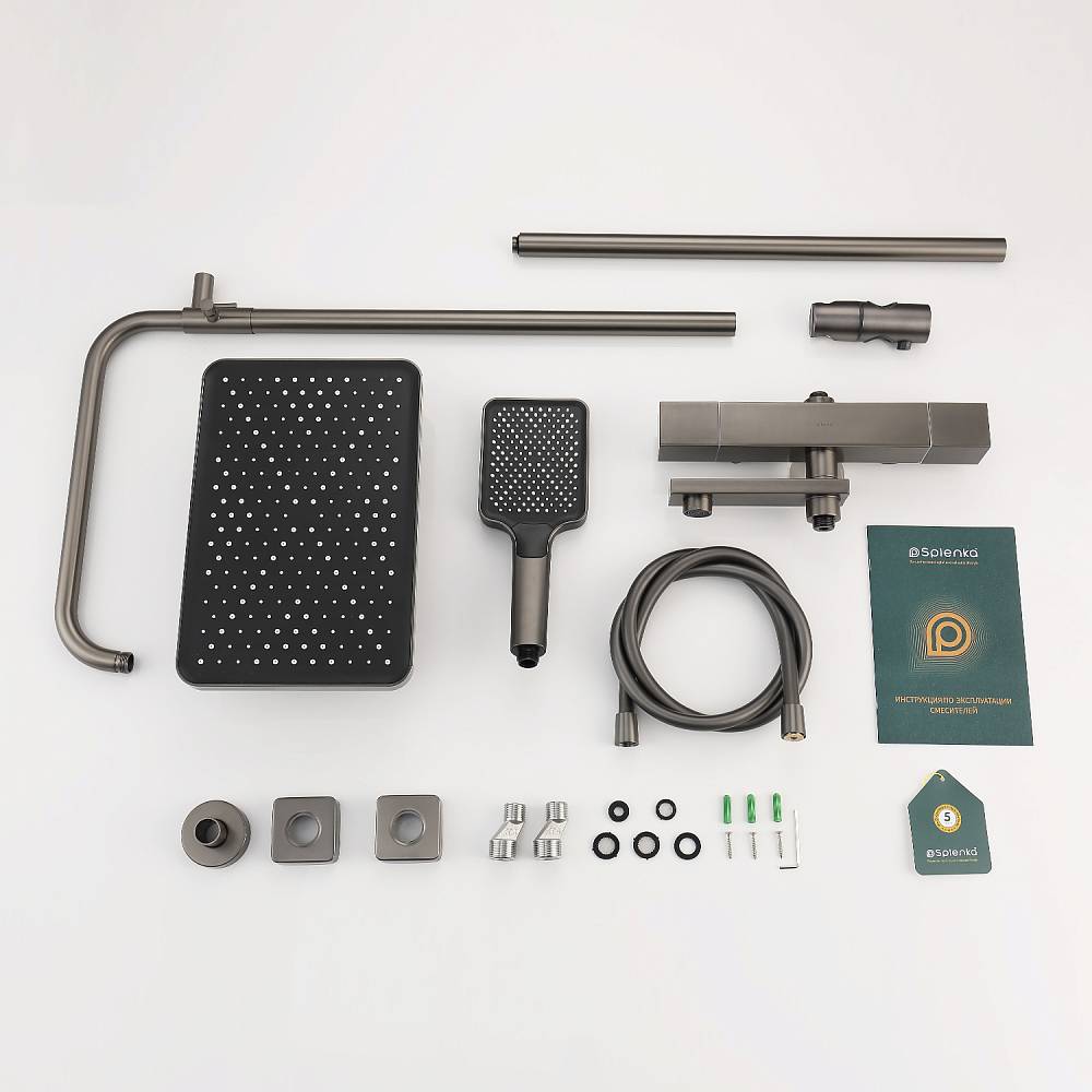Душевая система Splenka S224.26.09 в цвете «графит» оснащена встроенным термостатом, обеспечивающим точную поддержку заданной температуры воды и защиту от резких перепадов. Конструкция выполнена из высококачественной латуни, гарантирующей долговечность и устойчивость к коррозии. Однорычажное управление позволяет легко регулировать напор, а термостат — фиксировать комфортную температуру. В комплект входят: верхний душ прямоугольной формы (320 × 210 мм), ручной душ с тремя режимами струи (переключение кнопкой), металлический шланг длиной 1,5 м, регулируемая по высоте штанга (860–1480 мм), держатель ручного душа и монтажные элементы. Излив каскадного типа имеет поворотную конструкцию (длина 18,2 см). Система оборудована аэратором для равномерного потока и антиизвестковым покрытием поверхности. Высота конструкции — 151 см, вылет верхнего душа — 42 см. Стандарт подводки — G 1/2, пропускная способность — до 48 л/мин.