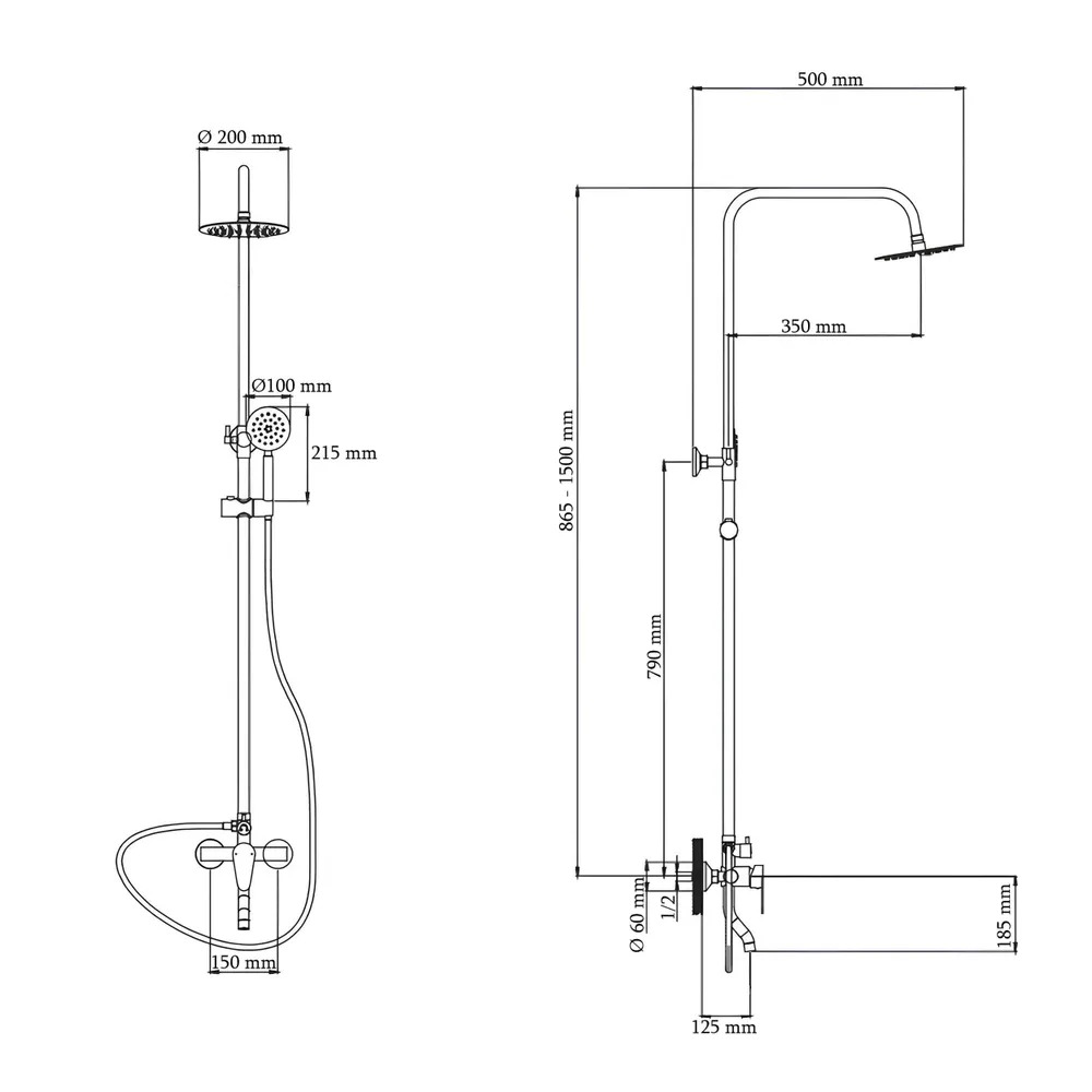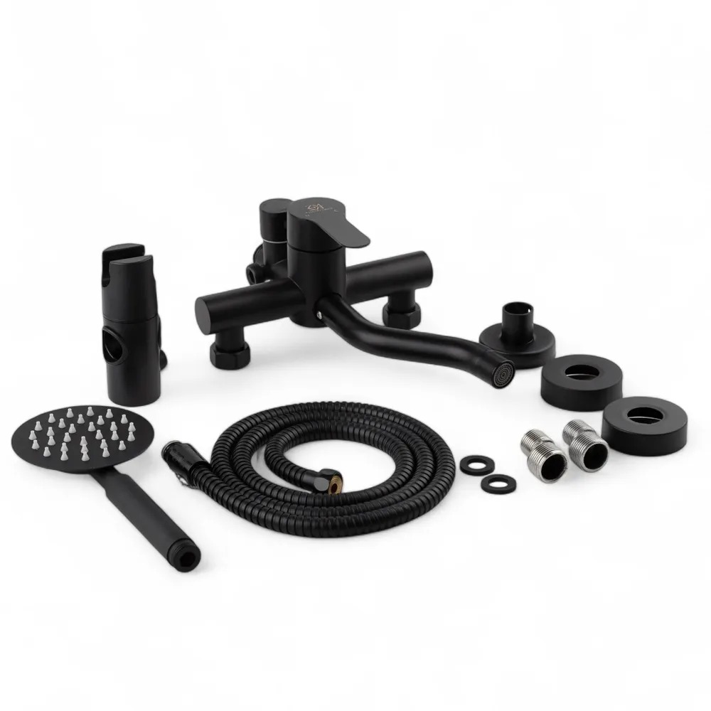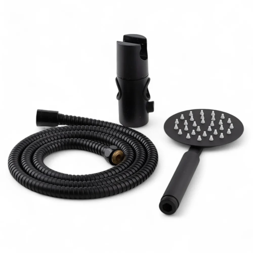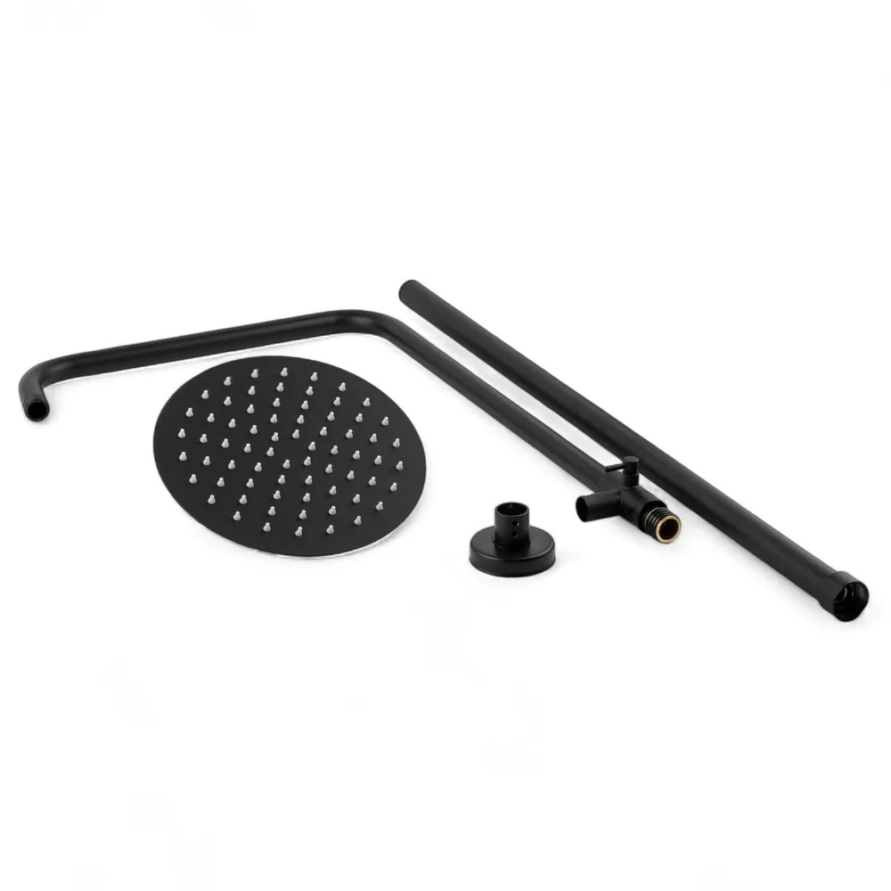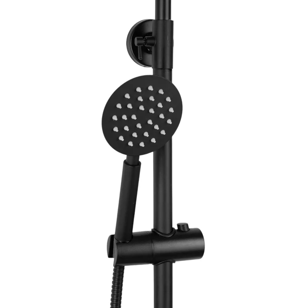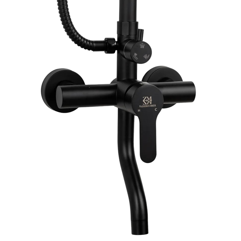 Душевая система Wasser Zimmer ZM‑7728‑18H в чёрном цвете представляет собой комплект с тропическим душем и шаровым смесителем. Конструкция включает стационарный смеситель с коротким изливом, телескопическую душевую стойку (регулировка высоты от 865 до 1500 мм), лейку тропического душа (диаметр 200 мм) и стандартную душевую лейку (диаметр 100 мм, высота 215 мм) на гибком шланге длиной 1500 мм. Переключение режимов осуществляется директором на корпусе смесителя; плавное регулирование температуры обеспечивает шаровый картридж. Габариты смесителя: ширина 195 мм, высота 290 мм, длина излива 12,5 мм, высота излива 180 мм. Комплектация: смеситель, эксцентрики, чашки, нижняя и верхняя штанги, крепление, шланг, обе лейки и держатель душевой лейки.