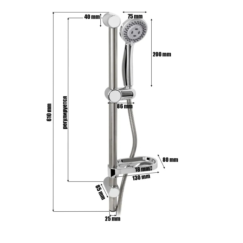 Конструкция оборудована держателем для душа с механической фиксацией, который можно регулировать по высоте. Это позволяет настроить стойку под индивидуальные потребности каждого пользователя. Хромированное покрытие не только придает изделию роскошный внешний вид, но и защищает от царапин и других повреждений.