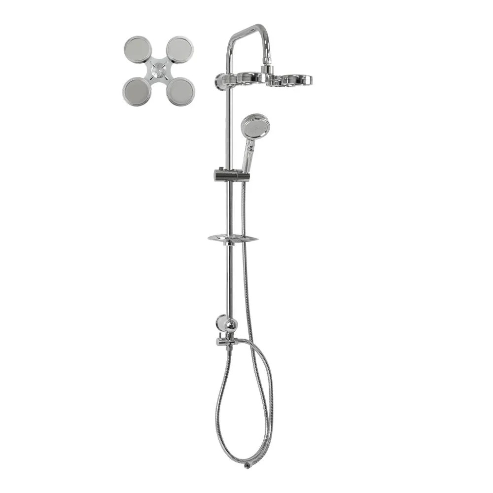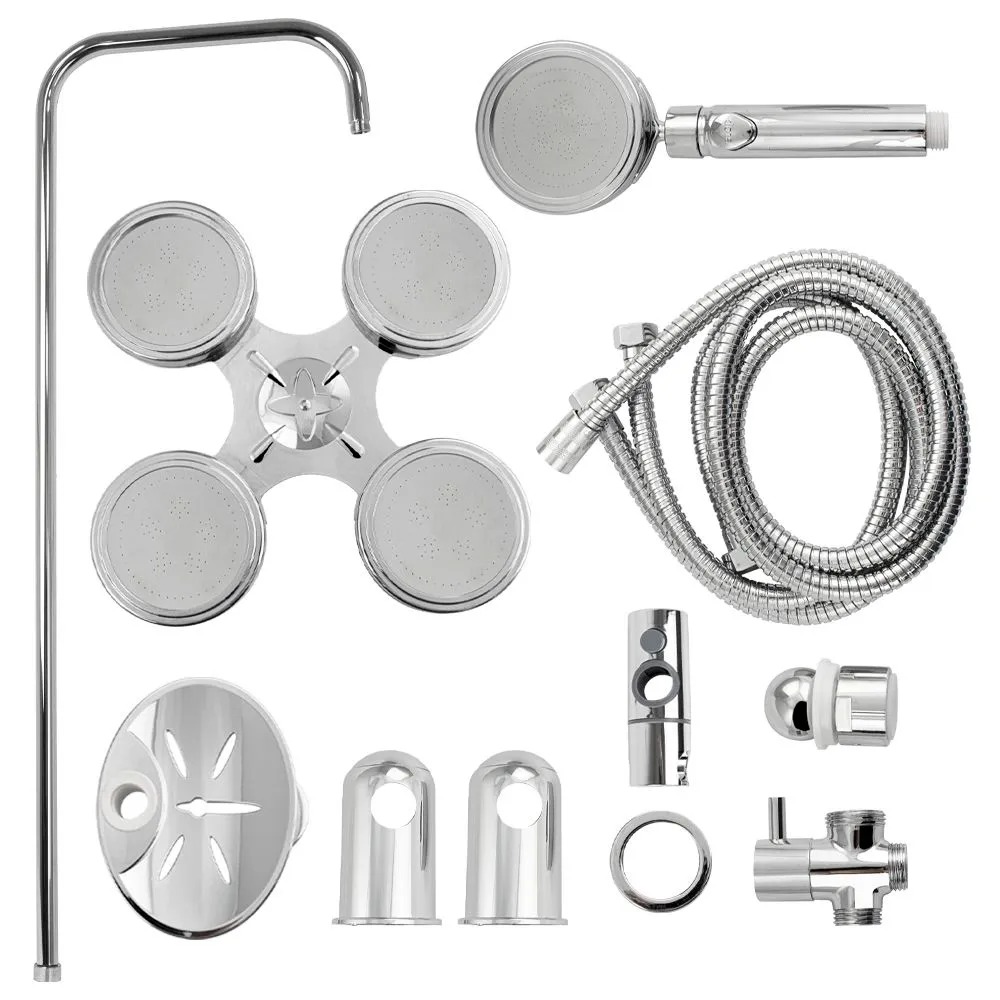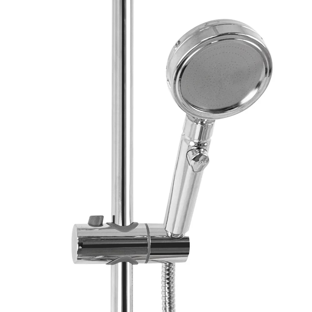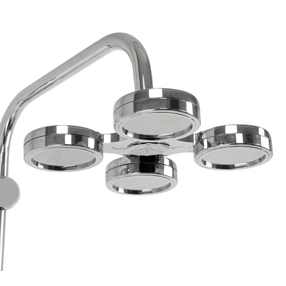 Душевая стойка тропический душ с круглыми лейками впишется в современную обстановку ванной комнаты. Произведена из нержавеющей стали и пластика АБС с хромоникелевым покрытием, износостойким и блестящим. Керамический переключатель работает даже при минимальном давлении воды, выдерживая свыше 300 000 рабочих циклов. Переключается поворотом ручки дивертора. Верхний душ с четырьмя форсунками произведен из пластика АБС и имеет шаровое крепление, что позволяет менять угол наклона, работает в режиме «Тропический дождь» создавая мягкий обволакивающий поток, струи равномерно покрывают тело, массируя и тонизируя кожу. Силиконовые форсунки защищены от известковых отложений и легко поддаются чистке. Встроенный аэратор равномерно распределяет поток воды, делая гигиенические процедуры комфортными. Ручная шарнирная лейка с кнопкой и с изменением угла излива произведена из высококачественного современного ABS-пластика, оснащена силиконовыми форсунками с функцией защиты от грязи и известковых отложений. Держатель лейки может менять угол поворота на 180° и регулироваться по высоте. Приятный бонус — встроенная пока с крючками. Подключение осуществляется к любому смесителю для ванной комнаты при помощи гибкого шланга 60 см с резьбой 1/2".