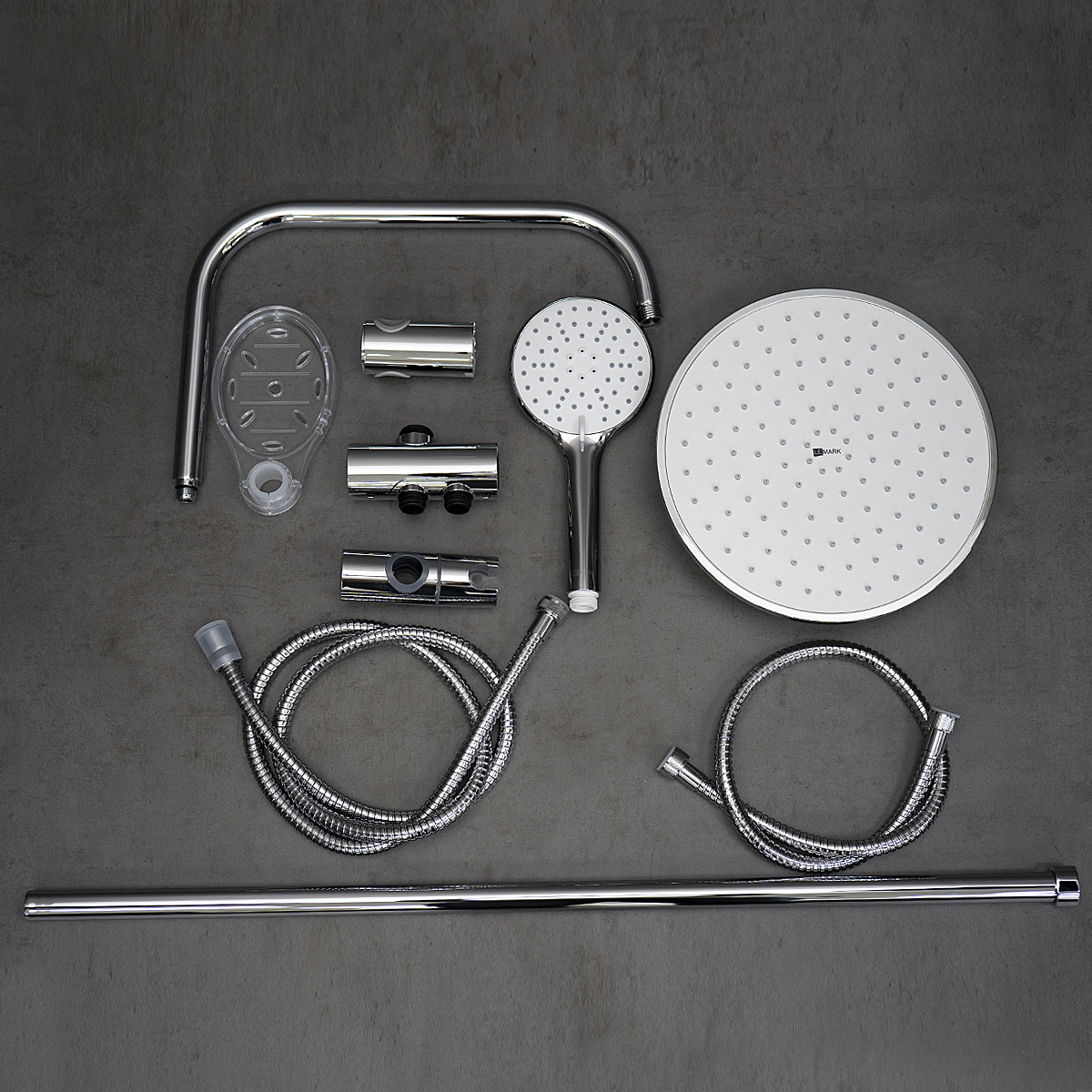 В комплект входят все необходимые элементы: душевой шланг длиной 150 см со стальной оплеткой и двойным загибом, дополнительный 80-сантиметровый шланг для подключения к смесителю, а также регулируемое по высоте крепление для ручной лейки.