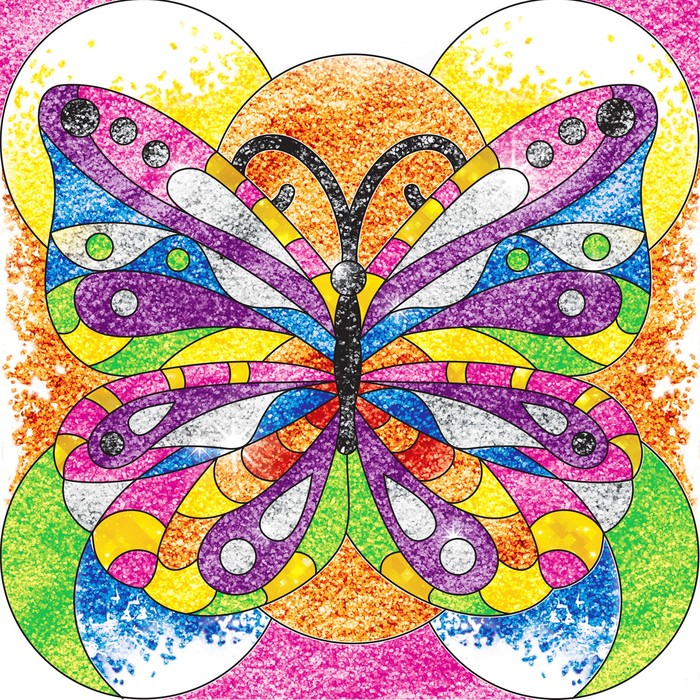 Клеевая основа защищена специальной бумагой, на которую нанесены прорезные контуры. Каждый цвет находится в своей зоне: отделяйте верхний слой стекой, добавляйте блёстки и песок, оформляйте элементы фольгой.