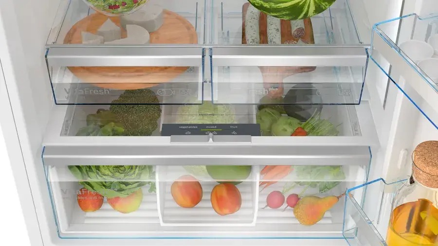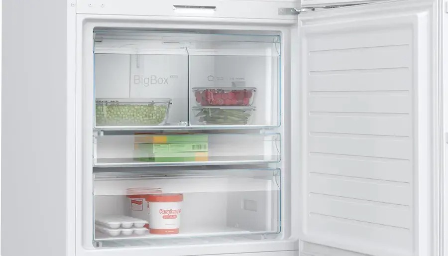 Технология Duo Cooling обеспечивает независимое охлаждение холодильной и морозильной камер двумя вентиляторами, поддерживая высокий уровень влажности в холодильной камере для сохранения свежести продуктов. Запахи не смешиваются, а работа холодильника бесшумна. Светодиодное освещение обеспечивает равномерный и яркий свет. Большой объем BigBox позволяет хранить крупные продукты, а выдвижные ящики морозильной камеры VarioZone увеличивают пространство для хранения.