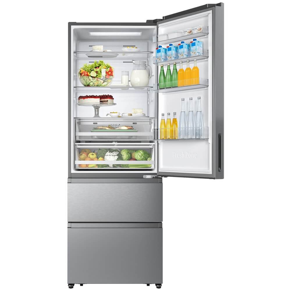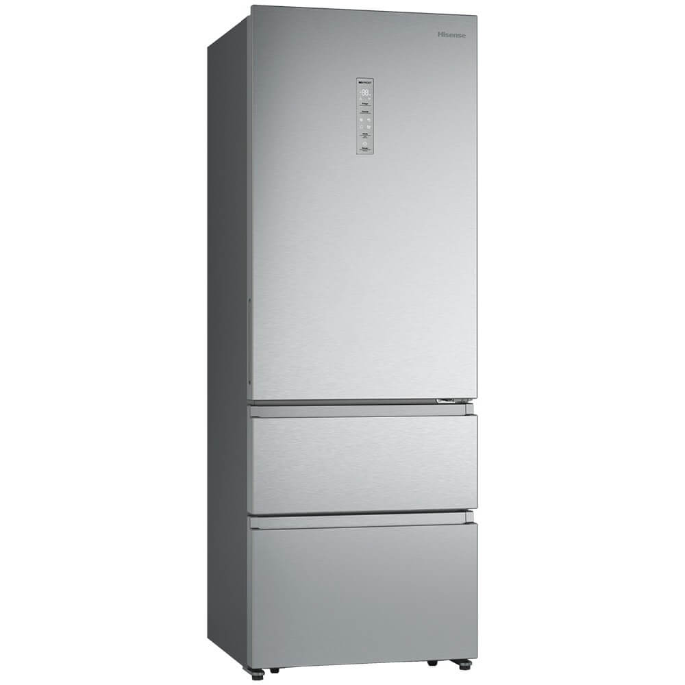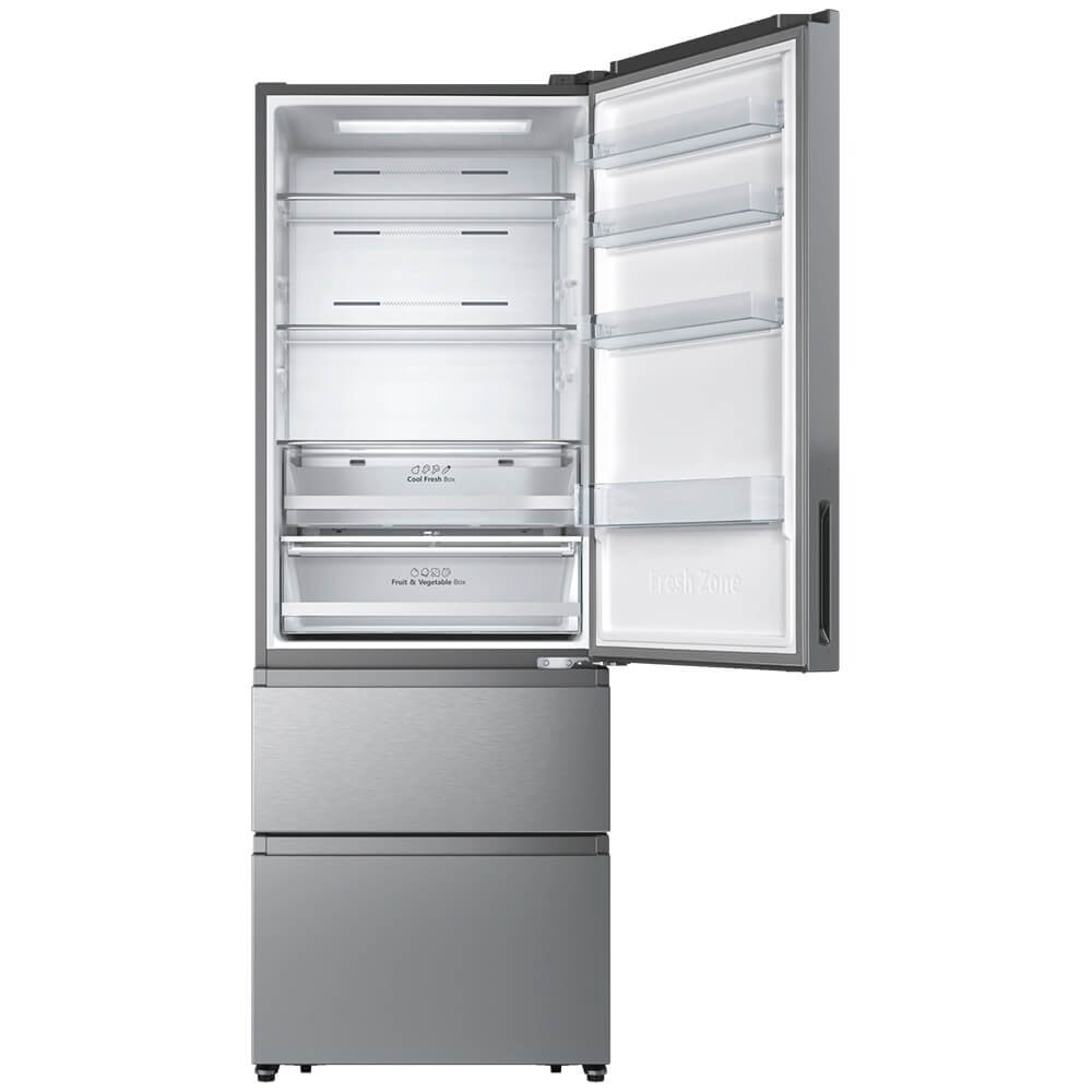 Холодильник многодверный Hisense RT641N4ACE серебристого цвета оснащен интеллектуальной системой распределения воздушных потоков MultiFlow. Она сама подбирает оптимальную температуру, чтобы дольше сохранить продукты во всех отсеках. В режиме «суперохлаждения» температура за короткое время понижается до 2° C. Это позволяет быстро охладить большое количество теплых продуктов. Влажная зона свежести предотвращает высыхание мяса, рыбы, овощей и сохраняет их сочность.