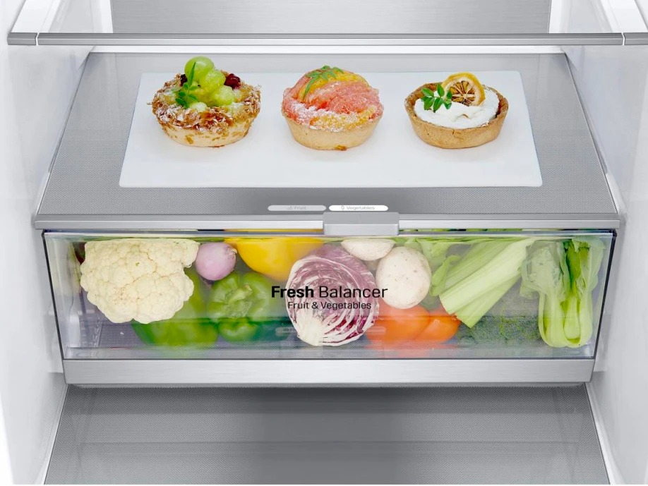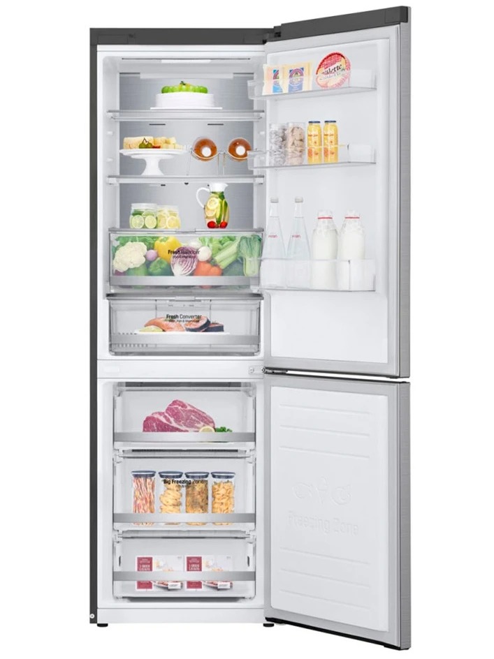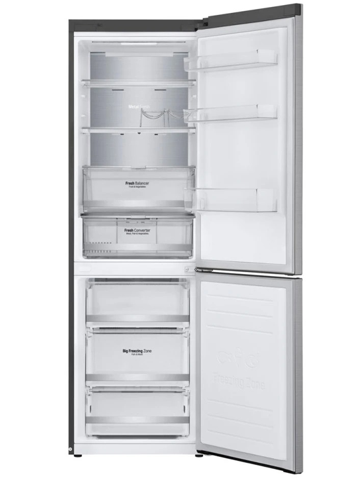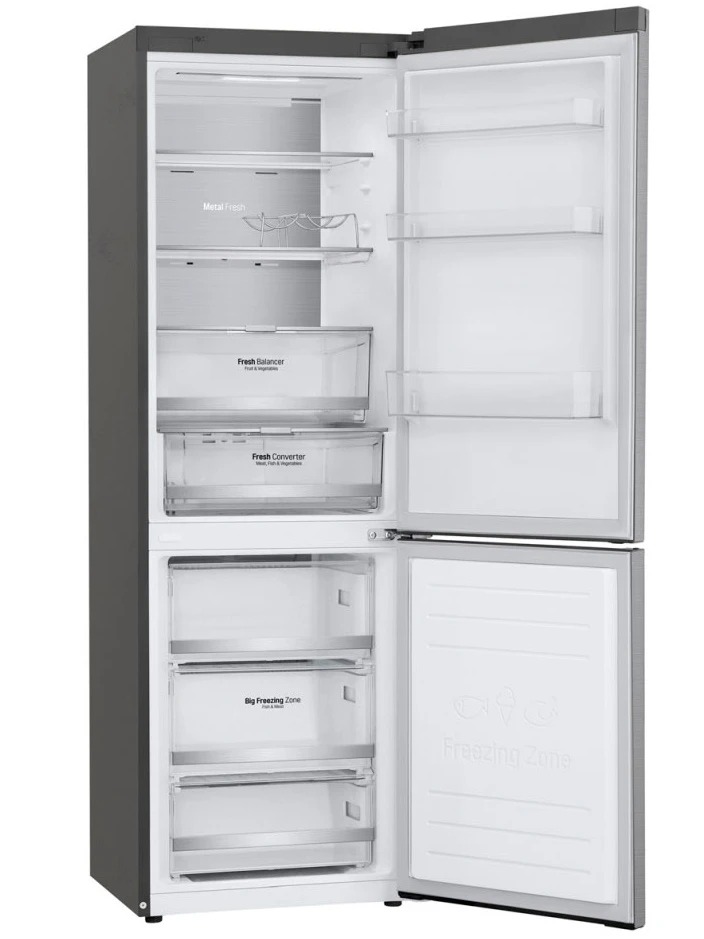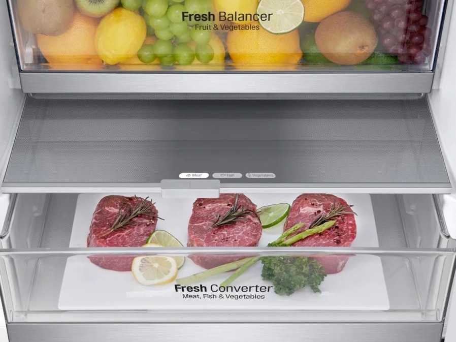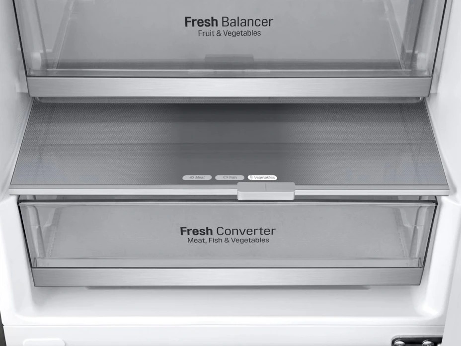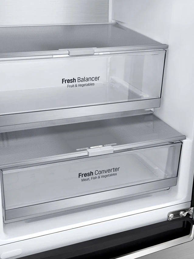 чем в предыдущих моделях. Тихая и надежная работа, чтобы ничего не нарушало вашего спокойствия дома. Усовершенствованная складная полка теперь имеет два этапа сложения, что позволяет хранить крупные и габаритные продукты или блюда. При помощи простого регулятора FRESHBalancer поддерживает оптимальную влажность для ваших овощей и фруктов. С помощью FRESHConverter можно выбрать один из трех температурных режимов (-2℃: Мясо/ 0℃: Рыба / 3℃: Овощи). С нулевым зазором холодильник LG можно ставить вплотную к стене и открывать дверь на 90°. Благодаря этому ящики выдвигаются беспрепятственно. Холодильники с технологией LG Total No Frost больше не требуют разморозки морозильной камеры, благодаря принудительному обдуву холодным воздухом.