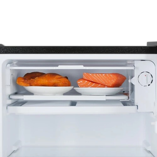 MAUNFELD MFF83WD дополнен небольшим морозильным отсеком с откидной дверцей. Холодильная камера оснащена настраиваемыми по высоте полками из закаленного стекла, выдерживающими до 20 кг. Широкий ящик позволяет отдельно хранить зелень, фрукты и овощи с поддержанием оптимальной влажности.
