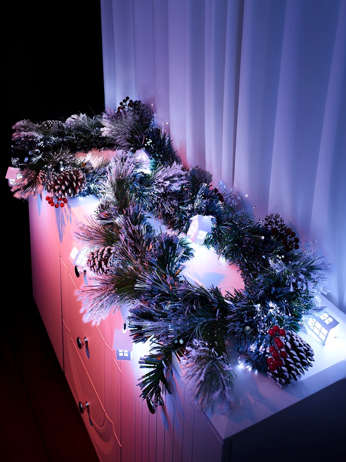 Разместите гирлянду на столе, вдоль подоконника или вокруг новогодней композиции — она мгновенно создаст атмосферу праздника и оживит интерьер, не требуя сложного ухода.