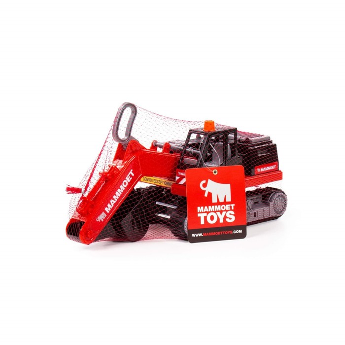 Яркая модель представляет собой копию экскаватора с подъемным ковшом.