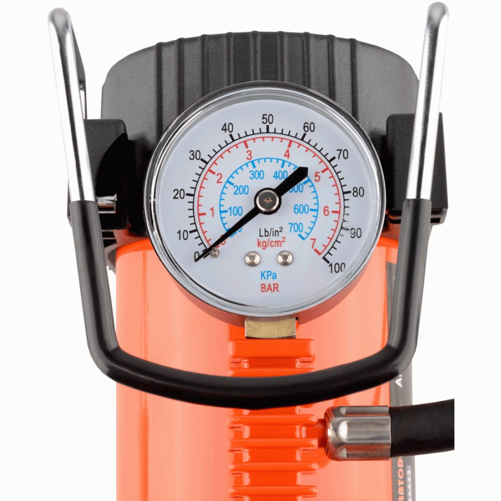 Длина электрического провода составляет 3 метра, а воздушного резинового шланга – 1 метр, что обеспечивает удобство использования. Компрессор оснащен аналоговым манометром для контроля давления. Максимальное давление устройства – 100 Psi, а потребляемый ток – 12 А.