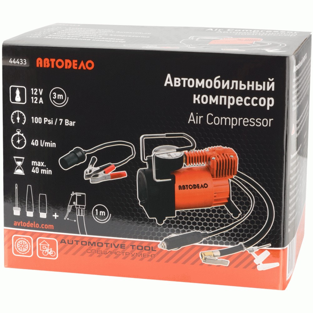 Автокомпрессор АвтоDело 44433– это компактное и удобное устройство для накачивания шин легковых автомобилей, микроавтобусов и внедорожников. В комплекте идут дополнительные насадки, которые позволяют использовать компрессор для накачивания резиновых лодок, матрасов, велосипедных шин, мячей, детских надувных игрушек и другого пневматического оборудования.