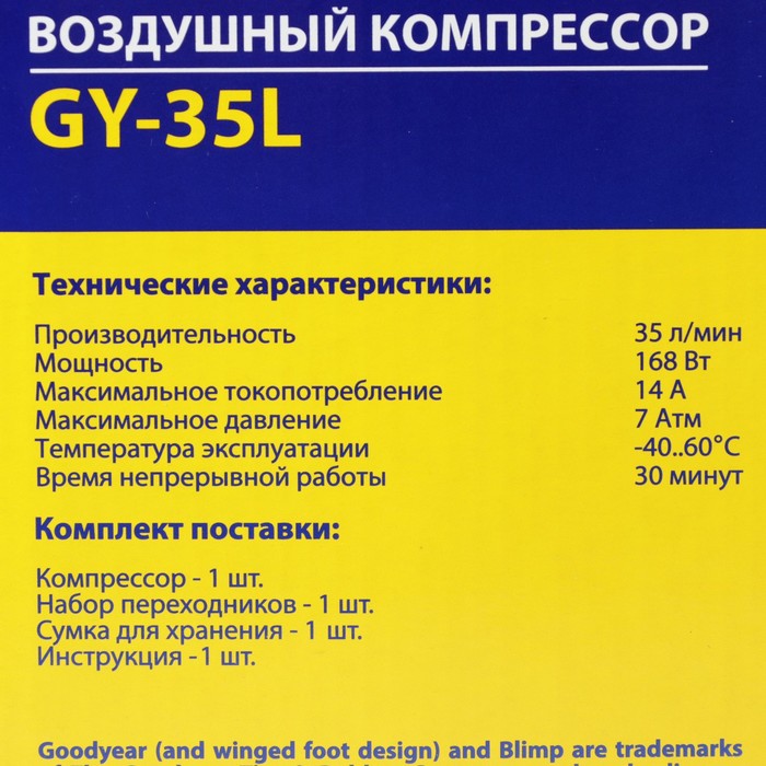 Корпус и поршневая группа компрессора Goodyear GY-35L сделаны из металла, что обеспечивает повышенную прочность и увеличенный ресурс.