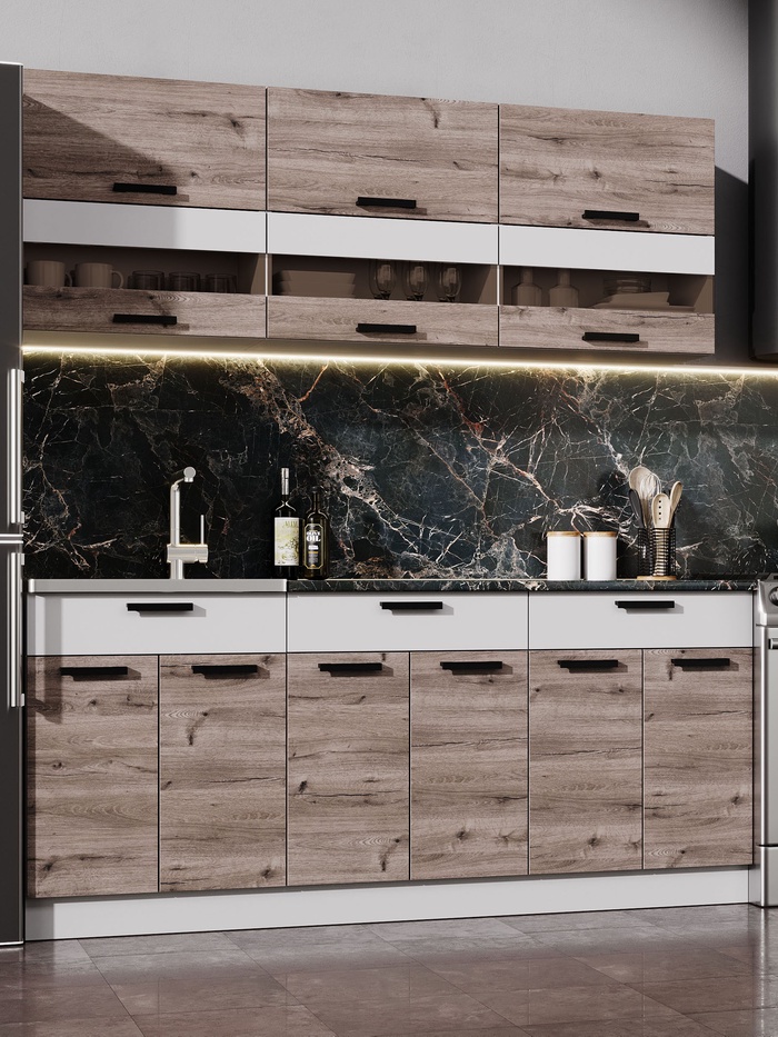 Прямой кухонный гарнитур обеспечивает организацию рабочей зоны и хранения на кухне с линейной планировкой. Модульная конструкция позволяет менять расположение шкафов при сборке, адаптируя гарнитур под особенности помещения.